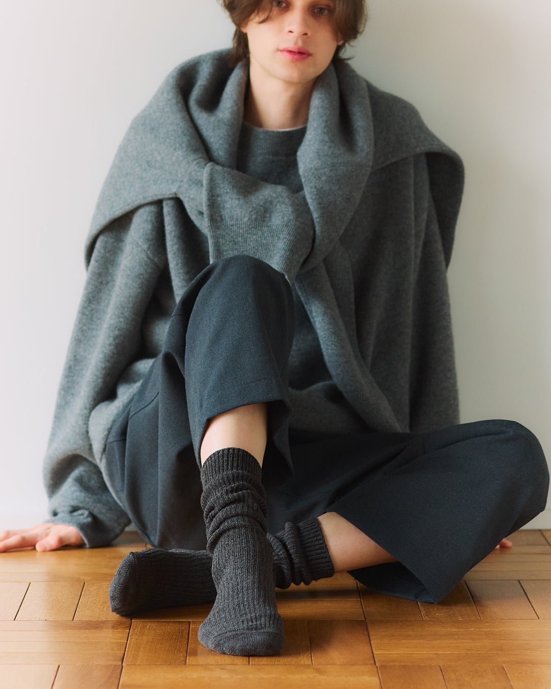 ルーズな表情とハリのある触感。 前シーズンよりリリースされたcrispyを更にアップデートしたモデル。 アクリルウールを入れ込むことで、ハリ感だけなくふっくらとした柔らかな表情もプラスされています。 リブ編み機をあえて低速でゆっくりと編み上げることで、ソフトな感触と表情に。 リラックス感がありながらも上質さを持ち合わせたソックスです。