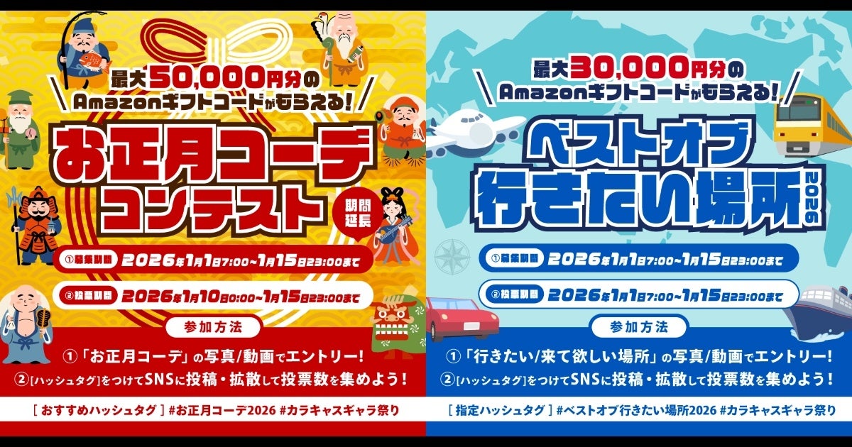 カラフルキャスティング株式会社(本社:東京都渋谷区、代表取締役:松本豊季)が運営する、誰でも無料で登録できる「プロフィール」を軸に、企業と個人、個人とファンを繋ぐエンタメアプリ「カラキャス」は、2026年1月1日から1月15日の期間中に開催した「#カラキャスギャラ祭り〜第1弾〜」の開催結果をお知らせいたします。