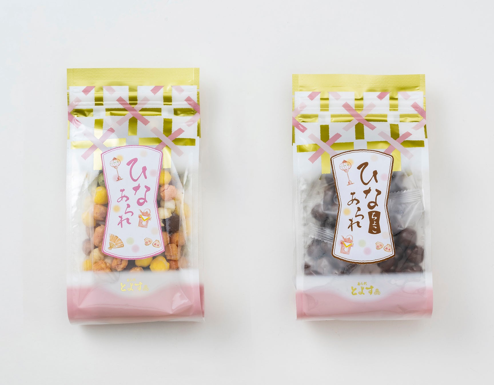 関西ではあられをひな壇に飾ったり、食べたりする風習がありましたが、1960年(昭和35年)頃に、初めて米菓メーカーとして商品化したのが、「とよす」です。京都で昔から伝わる宮中の雛菓子「引千切(ひっちぎり)」をヒントに、ひな壇に飾る美しいお菓子を作りたいというところからの発想でした。お米をそのままの形で膨らませた、甘い味付けの関東のひなあられと違い、関西のひなあられは、直径1cm くらいのもち米のあられで、5色のあられを混ぜたものをいいます。5色の色は、古く中国から伝わった陰陽五行の火=赤・木=青・土=黄・金=白・水=黒となり、魔除け・厄除けの意味があります。神社などでみかける幕や、こいのぼりの吹き流しもこの5色です。「とよすのひなあられ」は、えび・お砂糖・お醤油・青のり・サラダの5種類の味で5色を表現。子供たちの健やかな成長を願い、厄除けの祈りを込めました。昭和40年代からはもっと子供たちに喜んでもらいたいという想いからチョコレートのあられが加わり、現在のスタイルになりました。