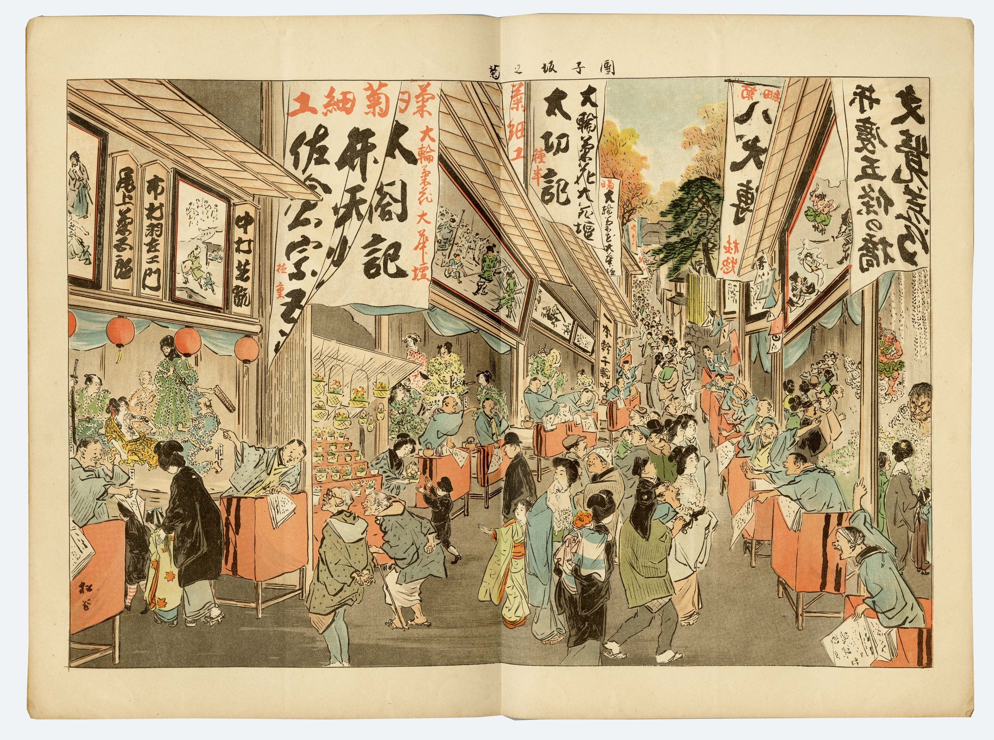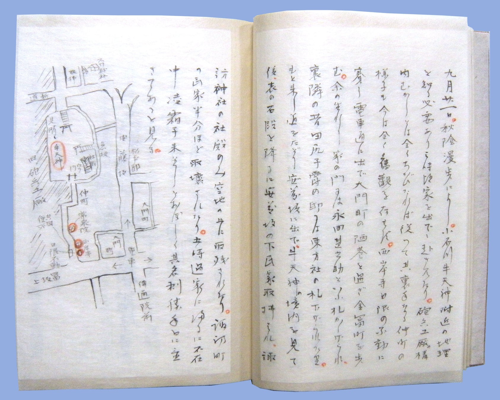 明治から昭和初期の近代文学の中には、文の京を人々が行きかい、名所が登場する作品があります。鴎外『青年』では主人公が根津神社を通り過ぎ、夏目漱石『三四郎』は東京大学構内、石川啄木『天鵞絨(ビロウド)』は混雑した本郷三丁目、徳田秋声『みち芝』は牛天神(北野神社)、中野重治『むらぎも』は富坂、泉鏡花『外科室』は小石川植物園が書かれました。志賀直哉は『クマ』で飼い犬を追って護国寺へと走ります。樋口一葉は、日記に名所への外出を書き残しました。