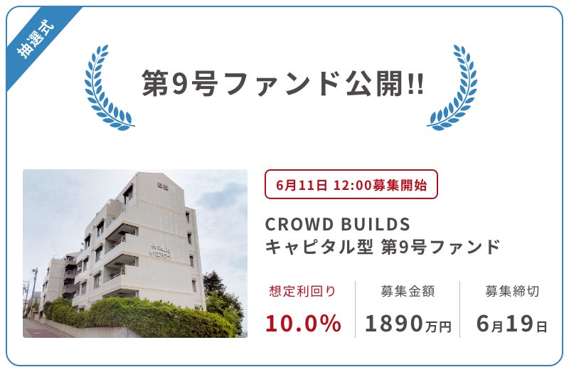 株式会社フィンスターが運営する不動産クラウドファンディングサービス「CROWD BUILDS(クラウドビルズ)」は、小規模不動産特定共同事業において、1口1万円からの投資が可能な不動産クラウドファンディングサービス「CROWD BUILDS キャピタル型 第9号ファンド」の募集を2024年6月11日(火)12:00より開始いたします。