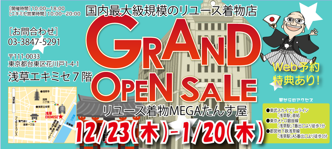 2021年12月23日に浅草エキミセ7Fにオープンした、中古着物の店としては国内最大級となる売り場面積116坪の「たんす屋」の超大型店舗です。開店記念として2021年12月23日~2022年1月20日の期間、「MEGAたんす屋グランドオープンセール」を開催中。浅草の着物女子の皆様、「黒」好きな方、キモノアールを観にいらしてください。グランドオープンセール中はWeb予約で粗品がもらえます。