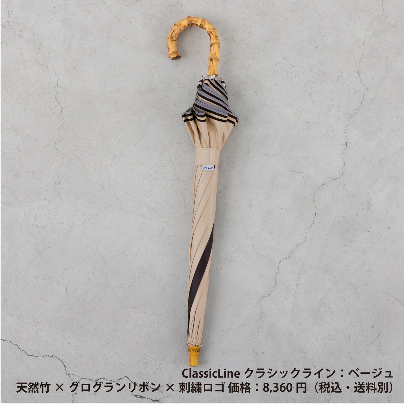 安全対策のため、傘を一周するグレーの反射テープとストライプのグログランリボンテープをデザインのアクセントとして組み合わせ。石突と手元の持ち手は環境にも配慮し、天然バンブー(竹)を使用。NuLAND®刺繍ロゴをあしらい全体的に可愛らしく優しい印象に仕上げています。