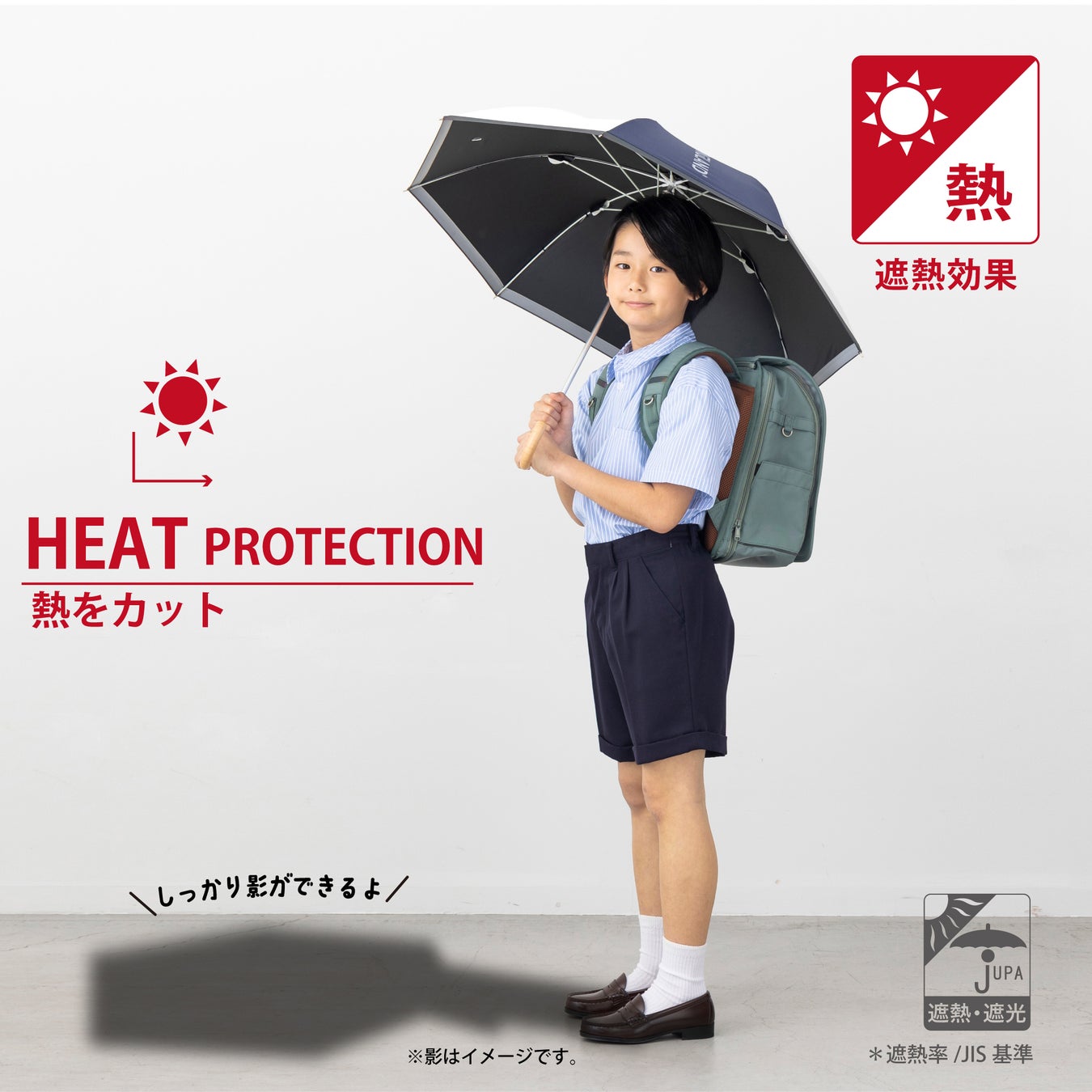 遮熱効果*のある傘で通学時の熱中症対策に貢献します。光を反射させることで温度の上昇を防ぎ、傘の下の温度上昇をおさえ、さしていない箇所との涼しさの違いを作り出します。
