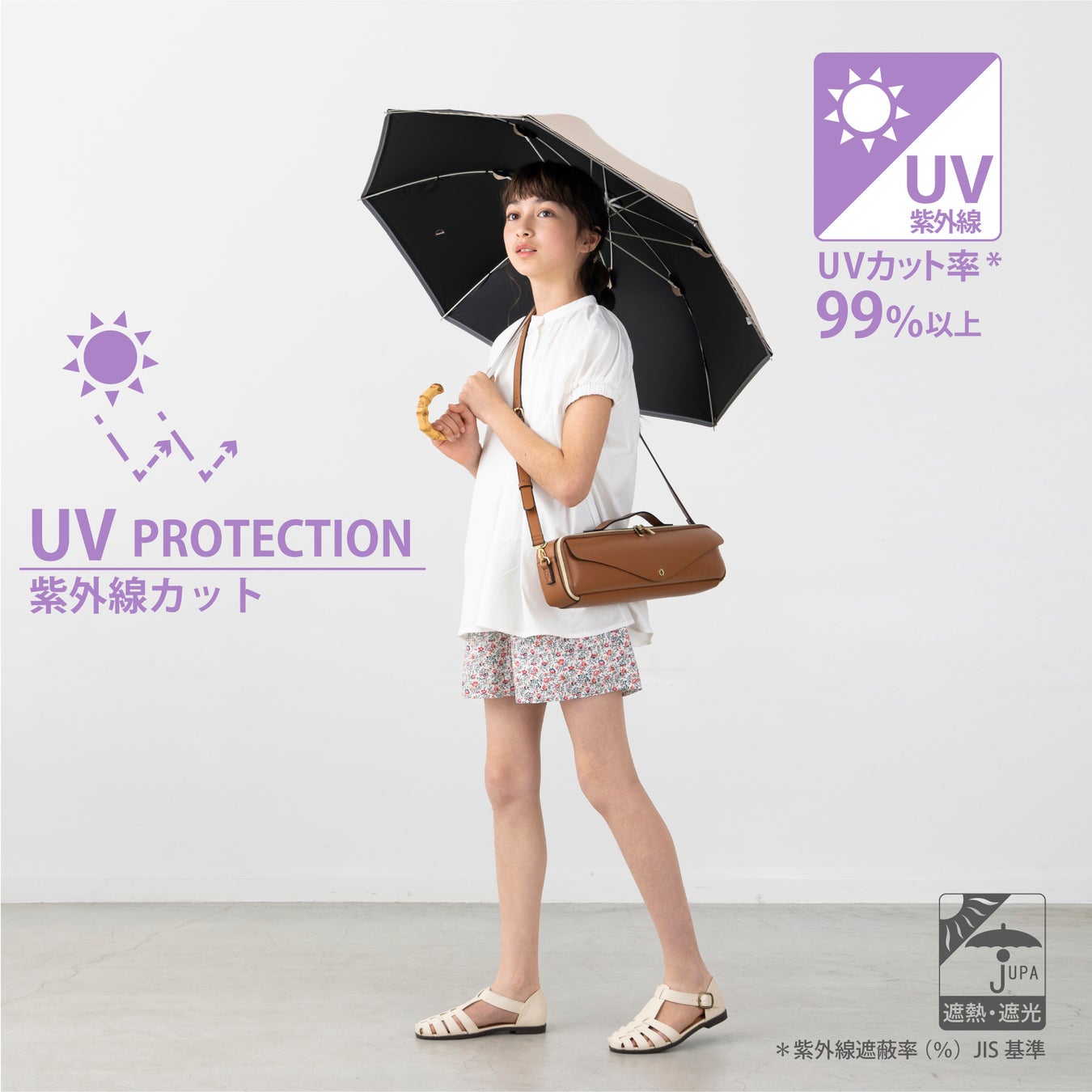 デザインも降雨時の使用において支障が無いよう工夫されておりますので、雨の日でもお使いいただけます。また、遮光・遮熱効果を目的とする加工を施し、日本洋傘振興協議会(JUPA)が定める遮光率・遮熱指数基準を満たす洋傘用遮光・遮熱加工生地を使用しております。