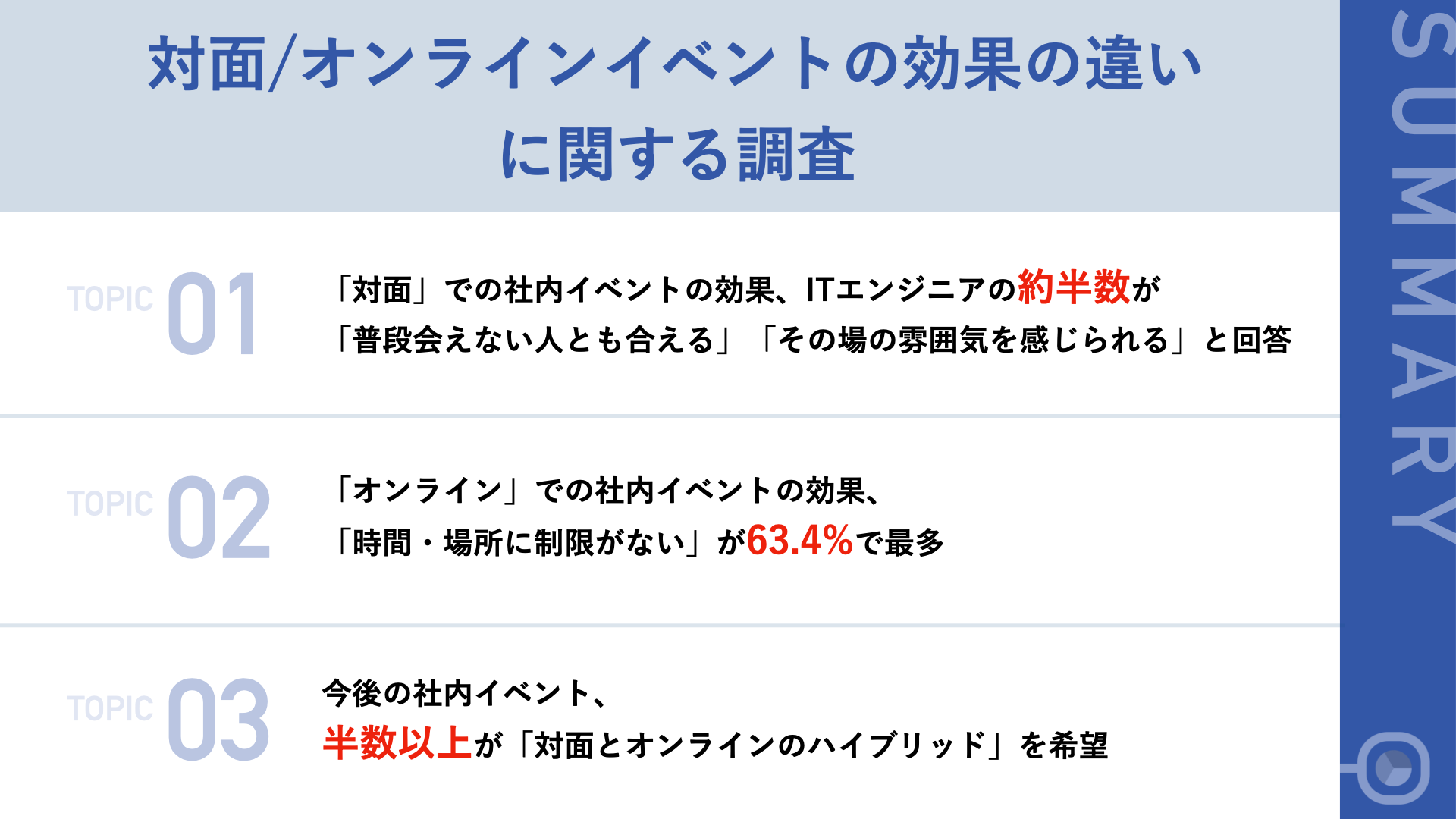 コロナ禍が始まり約3年、対面の価値について改めて考える必要があると言えるでしょう。ハイブリッド形式での社員総会を望む声が多い一方、オンラインやメタバースに比較的近い存在であるITエンジニアさえも、約10%が対面を希望していることから、オンラインではカバーしきれない対面でのコミュニケーションの価値が明らかになりました。社内イベントの形式としてハイブリッドでの開催を望む意見が多かった事実を鑑みると、今後はどの部分、どの要素までを対面もしくはオンラインで行うかなど、対面とオンラインの組み合わせ方が主な課題となるとなるのではないでしょうか。