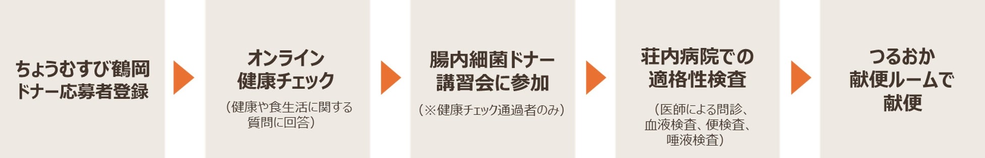 腸内細菌ドナーとして同施設での献便を希望される方は、「ちょうむすび鶴岡」上でドナー応募者登録を行い、オンライン健康チェックを受けた後、鶴岡市立荘内病院での「医師による問診」、「血液検査」、「便検査(腸内細菌叢検査を含む)」、「唾液検査」を受けます。すべての検査結果に基づき、医師が適格性判断を行い、腸内細菌ドナーとして適格であると判断された方のみ正式なドナーとして認定され、献便が可能となります。腸内細菌ドナーは、つるおか献便ルーム内の専用トイレで便を提供し、ドナーには献便1回あたり最大5千円の献便協力金が支払われます。また、「ちょうむすび鶴岡」上では、ドナー適格性検査時に行った腸内細菌叢検査の結果や献便回数を確認することができ、献便を行うことで継続的な腸内環境の確認や健康維持につながります。