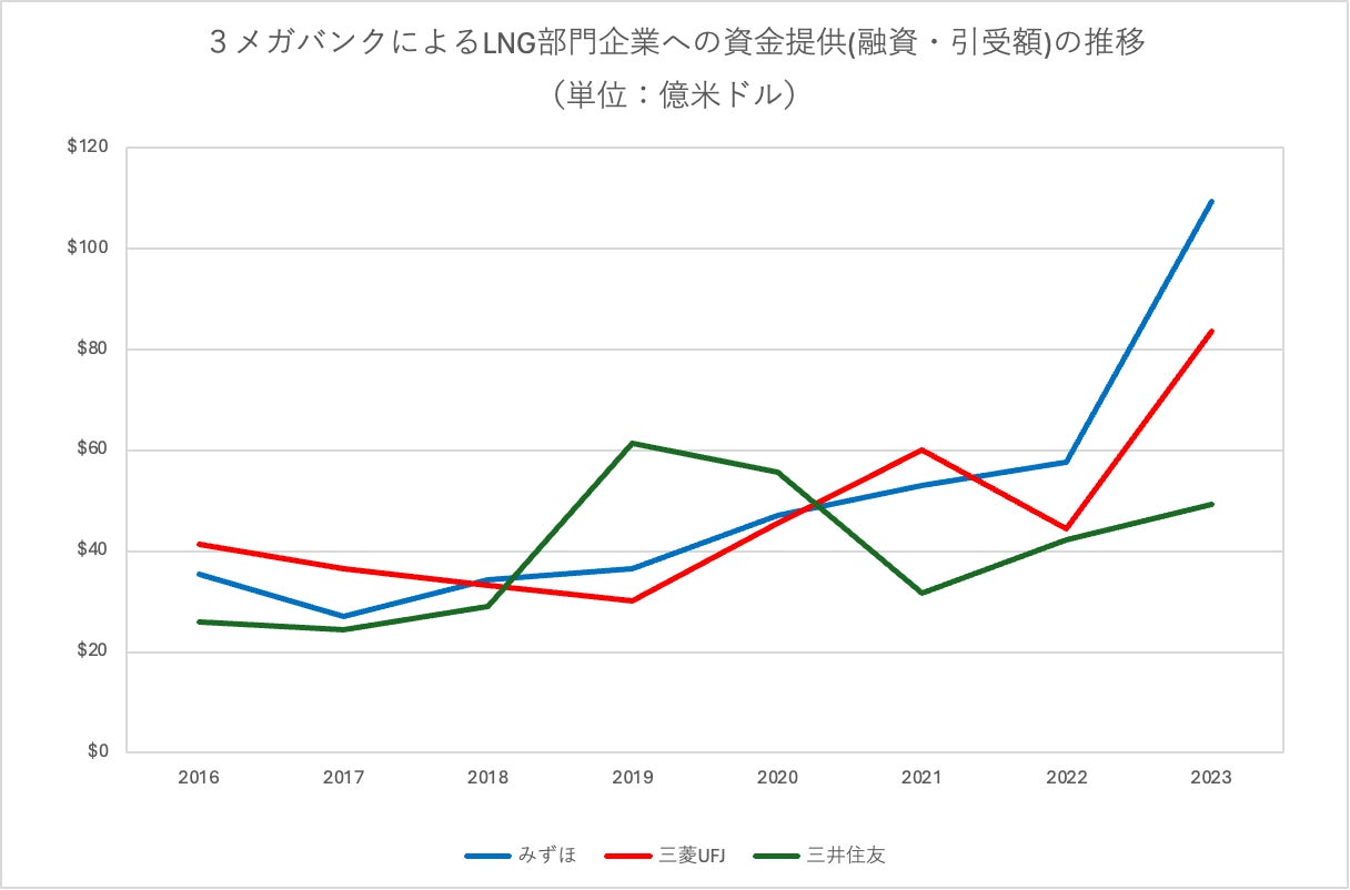 全3行が、2023年の「化石燃料拡大企業」、「メタンガス(LNG))」、「北極圏の石油・ガス」、「超深海の石油・ガス」部門への資金提供額で、ワースト10に入りました。中でもLNG事業を拡大した130社への資金提供額では、みずほが1位(約109億ドル)、MUFGが2位(約84億ドル)で、3位のサンタンデール(スペイン)を引き離し、前年比でそれぞれ90%、88%増加しました。60行全体の提供額は約1,209億ドル、前年比で4%増加したことから、メガバンクを含めた上位行が牽引していることは明らかです。