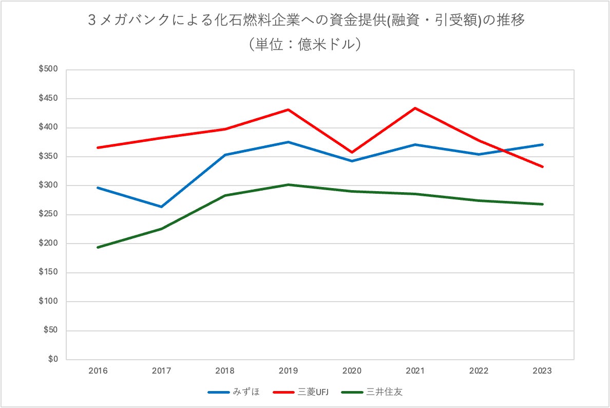 日本の3メガバンクは、昨年の資金提供と、パリ協定後の資金提供の両方でワースト10に入りました。中でも三菱UFJフィナンシャル・グループ(MUFG)はパリ協定後の「化石燃料全部門」への資金提供で4位(約3,077億ドル)、みずほフィナンシャルグループ(みずほ)は2023年の「化石燃料全部門」と「化石燃料事業を拡大している企業」(以下、化石燃料拡大企業)への資金提供の両方で2位に順位を上げました。環境NGOらは4月、3メガバンクに気候変動対策の強化を求める株主提案を提出しています(注2)。