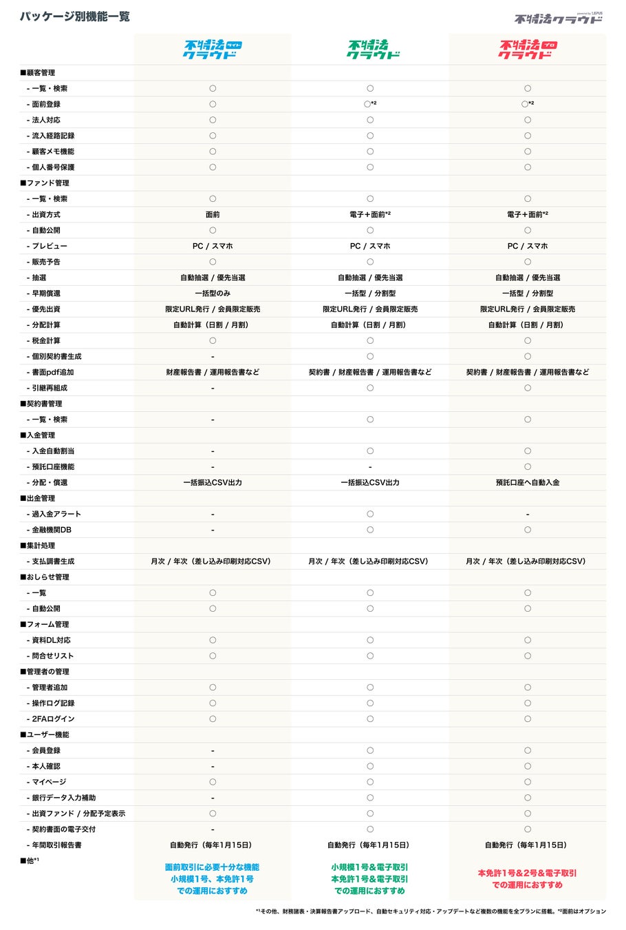 『不特法クラウド』は、面前のみからクラウドファンディングまで、事業者の導入フェーズや事業規模に合わせた3つのプランをご用意しています。