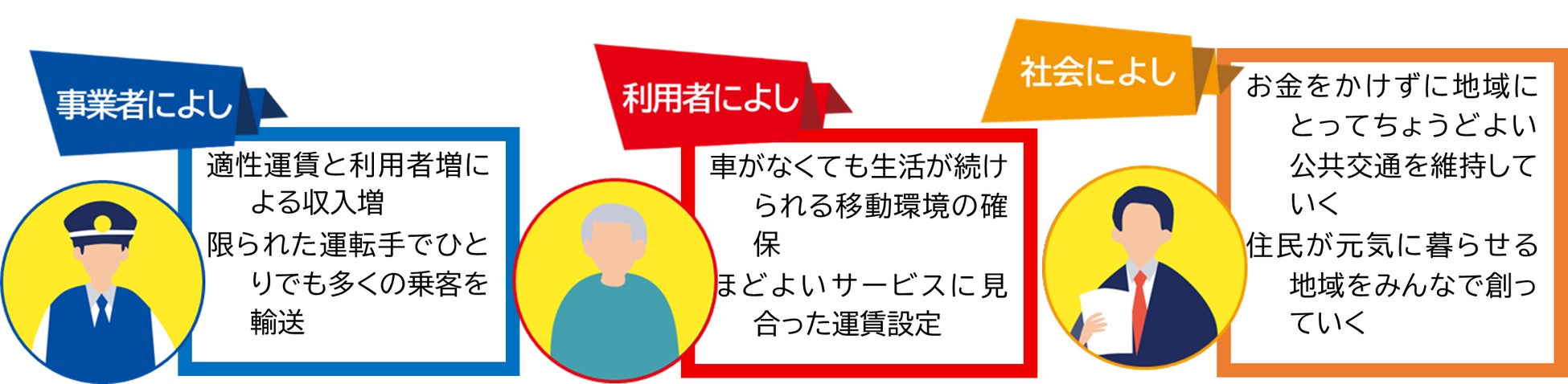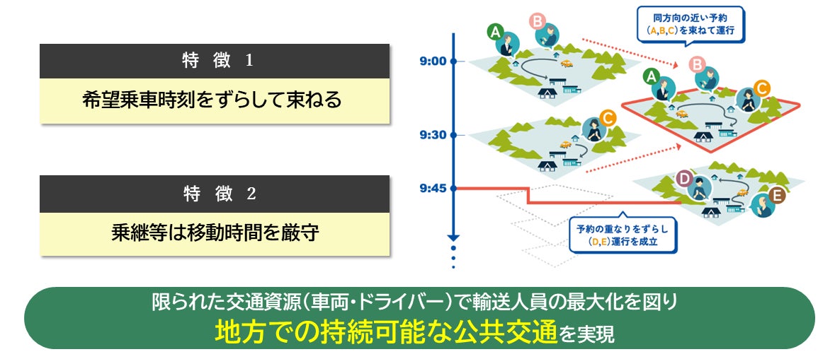 需要と供給ともに少ない地方で、利用者の発着時間を少しずつずらしながら、1台の車両の輸送人数を最大化し、運行コストを最小化することを目指した配車システムです。