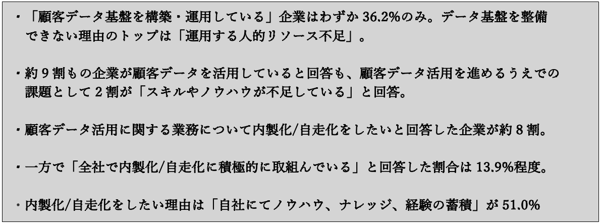 今回の調査により、企業における顧客データ基盤の構築・運用のニーズはあるが、課題は「人的リソース不足」という状況が浮き彫りになりました。