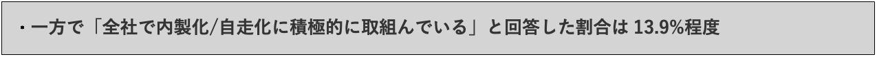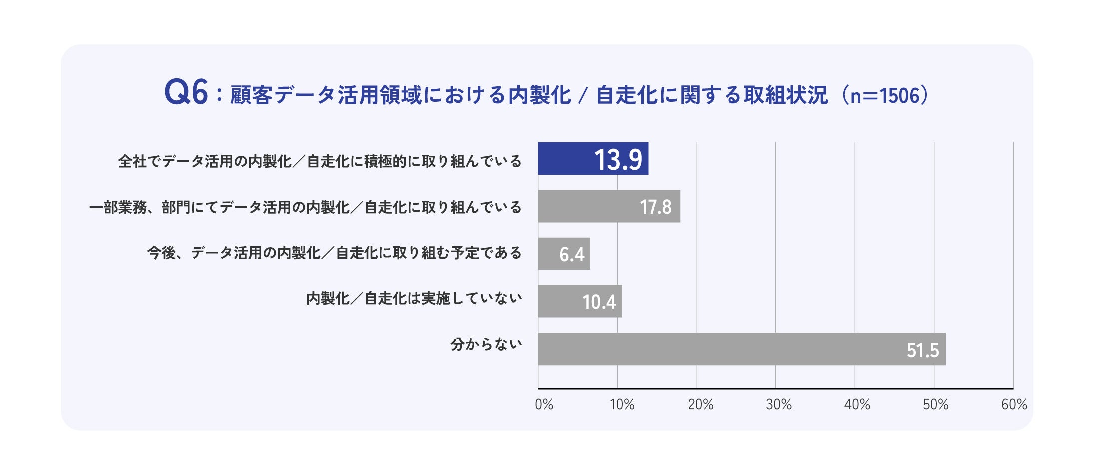 また、顧客データ活用の内製化/自走化のニーズは78.4%と高い一方、全社で内製化/自走化に取組んでいる企業はわずか13.9%という状況でした。