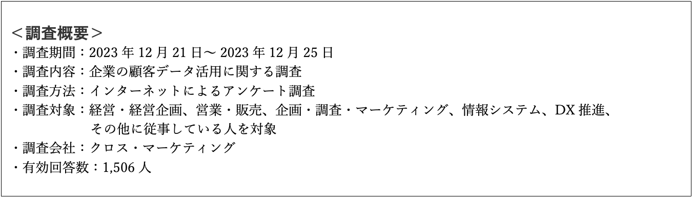 上記を踏まえ、現在の顧客データの活用状況や、運用課題、企業のデータ活用の内製化や自走化に対する意向を探るべく、「企業の顧客データ活用に関する調査」を実施しました。