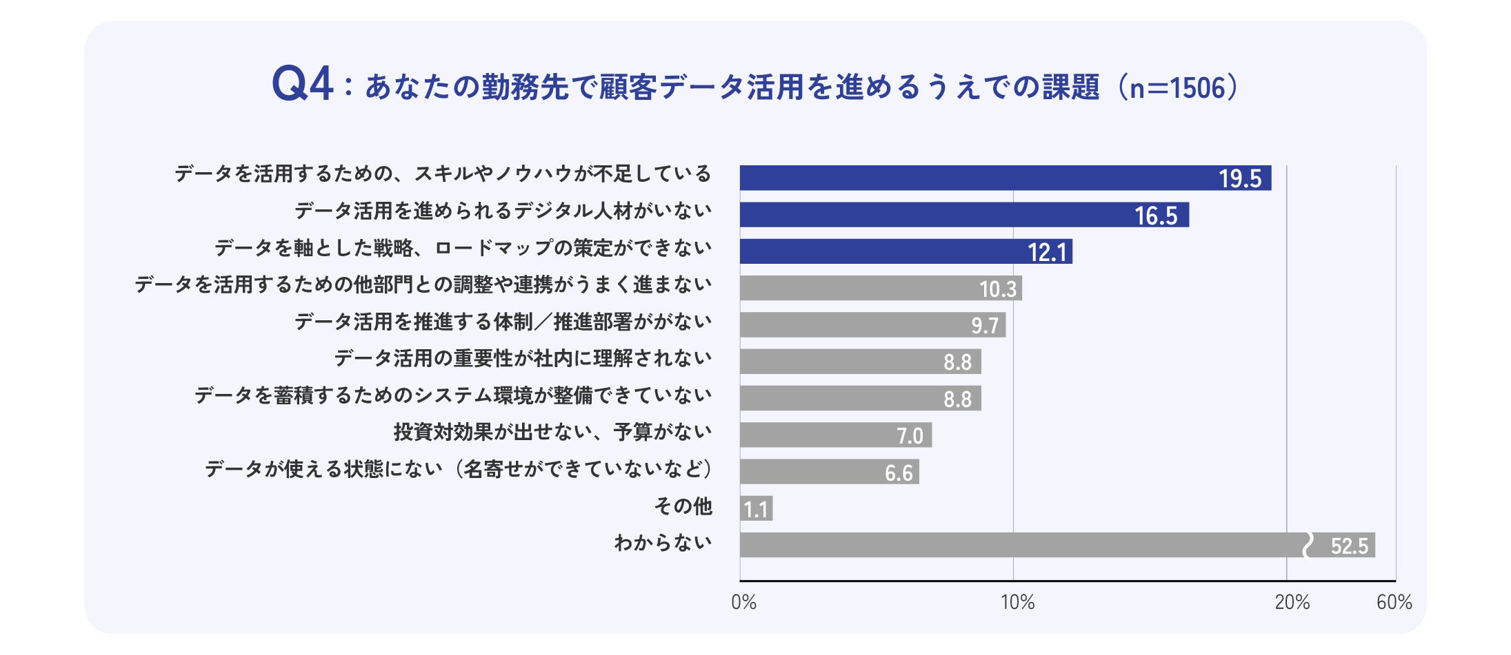 また、データ基盤の構築の有無に関わらず、顧客データ活用の課題を調査した所、「分からない」を除き、「データを活用するための、スキルやノウハウの不足している」が19.5%で多く、次に「データ活用を進められるデジタル人材がいない」が16.5%、「データを軸とした戦略、ロードマップの策定ができない」が12.1%と続きました。