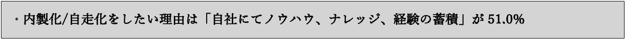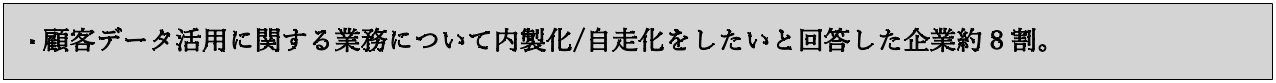 内製化/自走化をしたい理由の上位に、「自社にて顧客データ活用のノウハウ、ナレッジ、経験の蓄積のため」、「外部への委託コストの削減のため」、「ビジネス変化への柔軟な対応のため」が見られ、迅速かつ柔軟な意思決定やアクション実行のための内製化/自走化のニーズが高いことも分かりました。