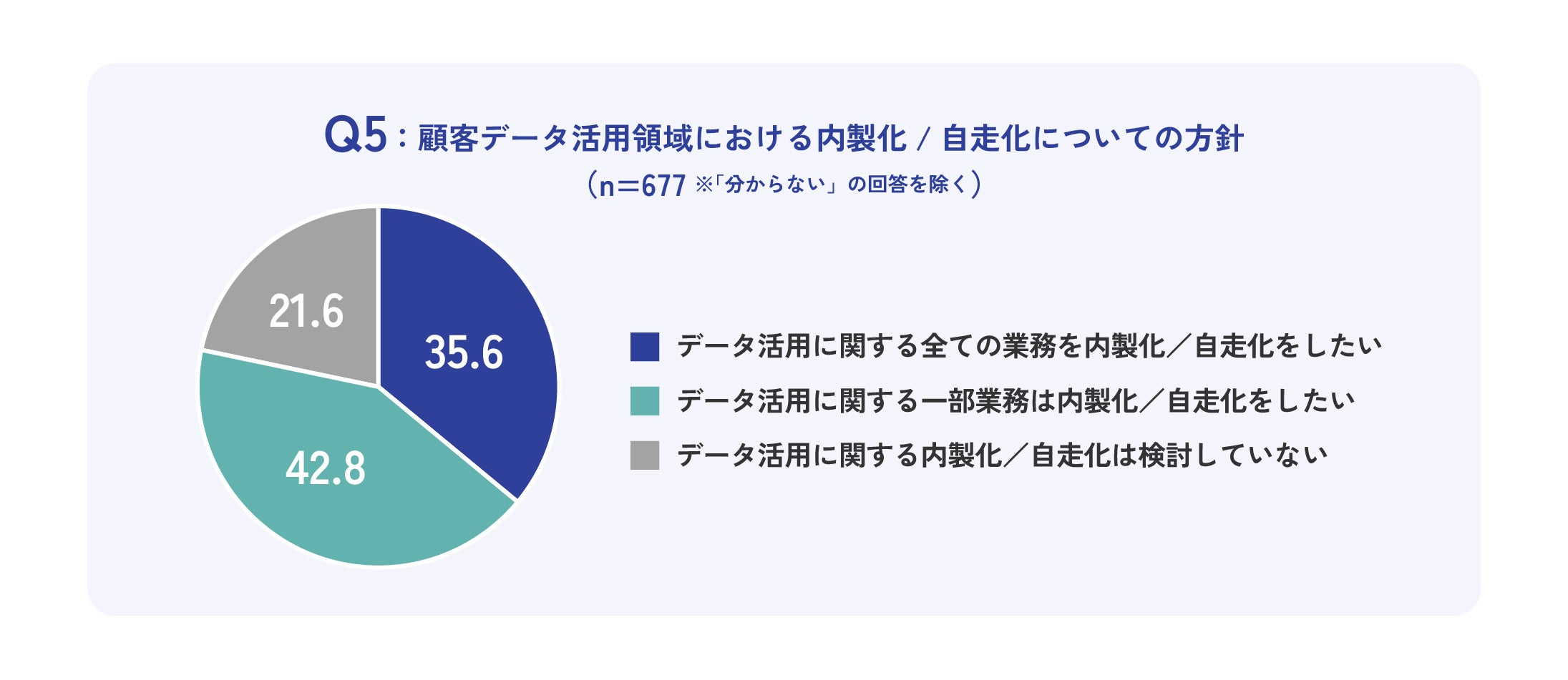 次に、顧客データ活用領域における内製化/自走化に関しての方針について尋ねたところ、「データ活用に関する全ての業務を内製化/自走化をしたい」が35.6%、「データ活用に関する一部業務は内製化/自走化をしたい」が42.8%で、合わせて78.4%の企業が、データ活用に関する業務を内製化/自走化の意向が高いことが明らかになりました。