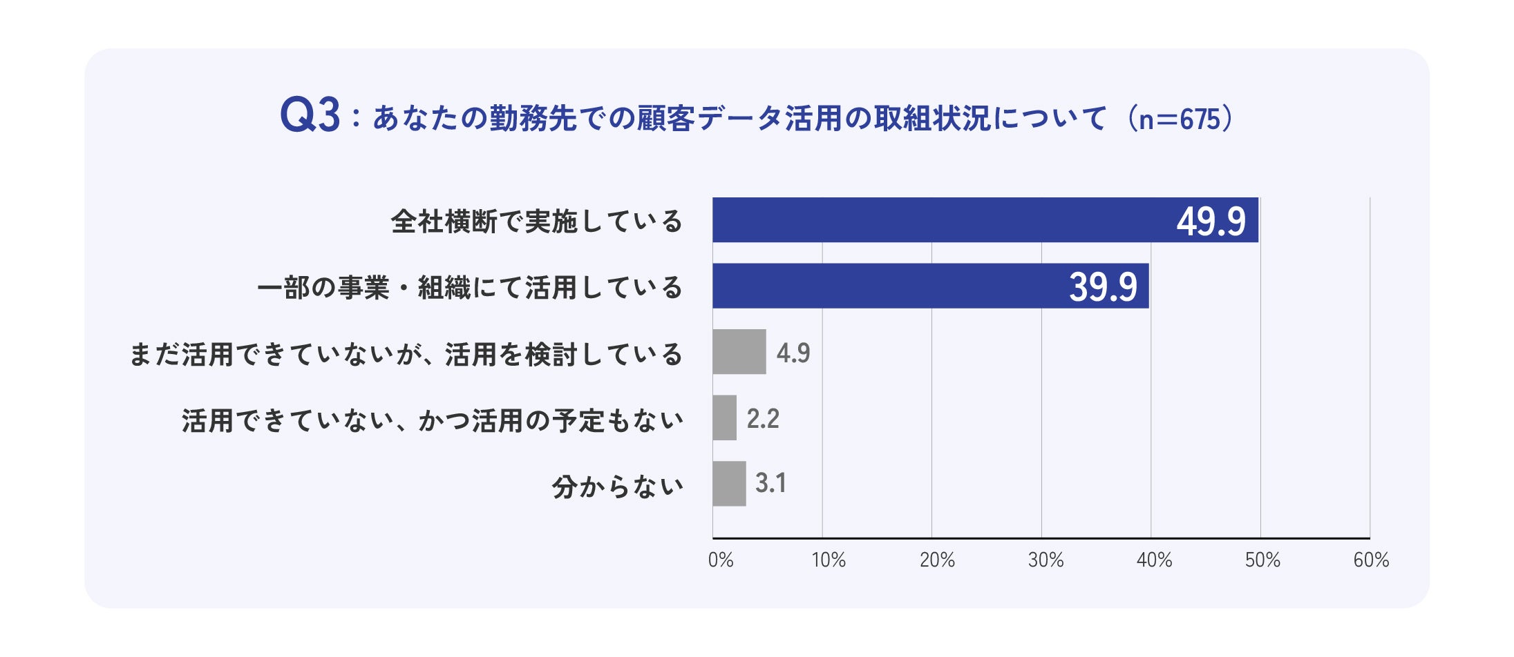 約9割の企業は、全社、もしくは一部の事業で顧客データの活用を推進していることが明らかに。