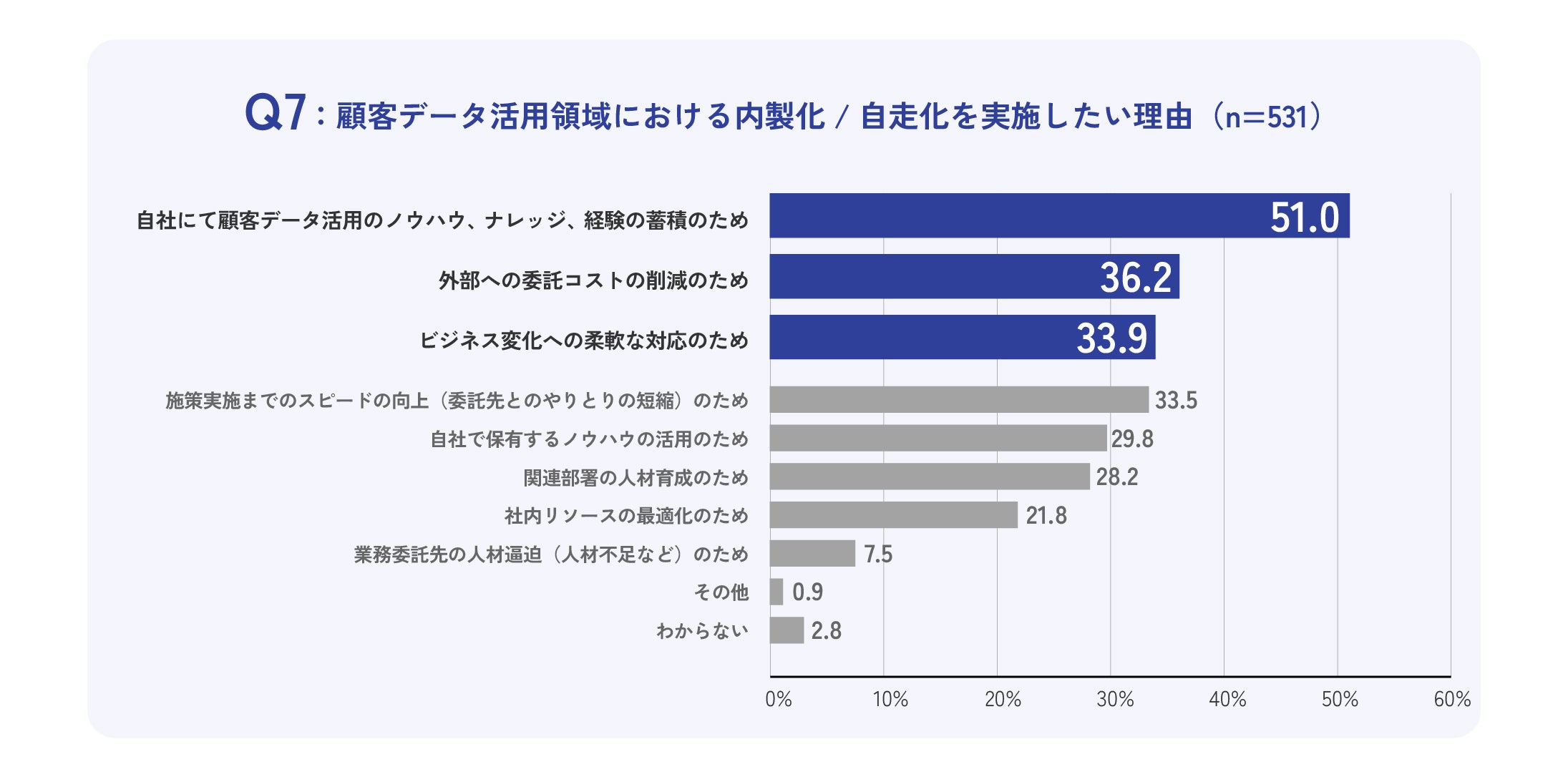 Q3で、「データ活用に関する全ての業務を内製化/自走化をしたい」、「データ活用に関する一部業務は内製化/自走化をしたい」と回答した人に、内製化/自走化をしたい理由を尋ねたところ、「自社にて顧客データ活用のノウハウ、ナレッジ、経験の蓄積のため」の51.0%がトップで、その次に「外部への委託コストの削減のため」の36.2%、「ビジネス変化への柔軟な対応のため」が33.9%で続きました。
