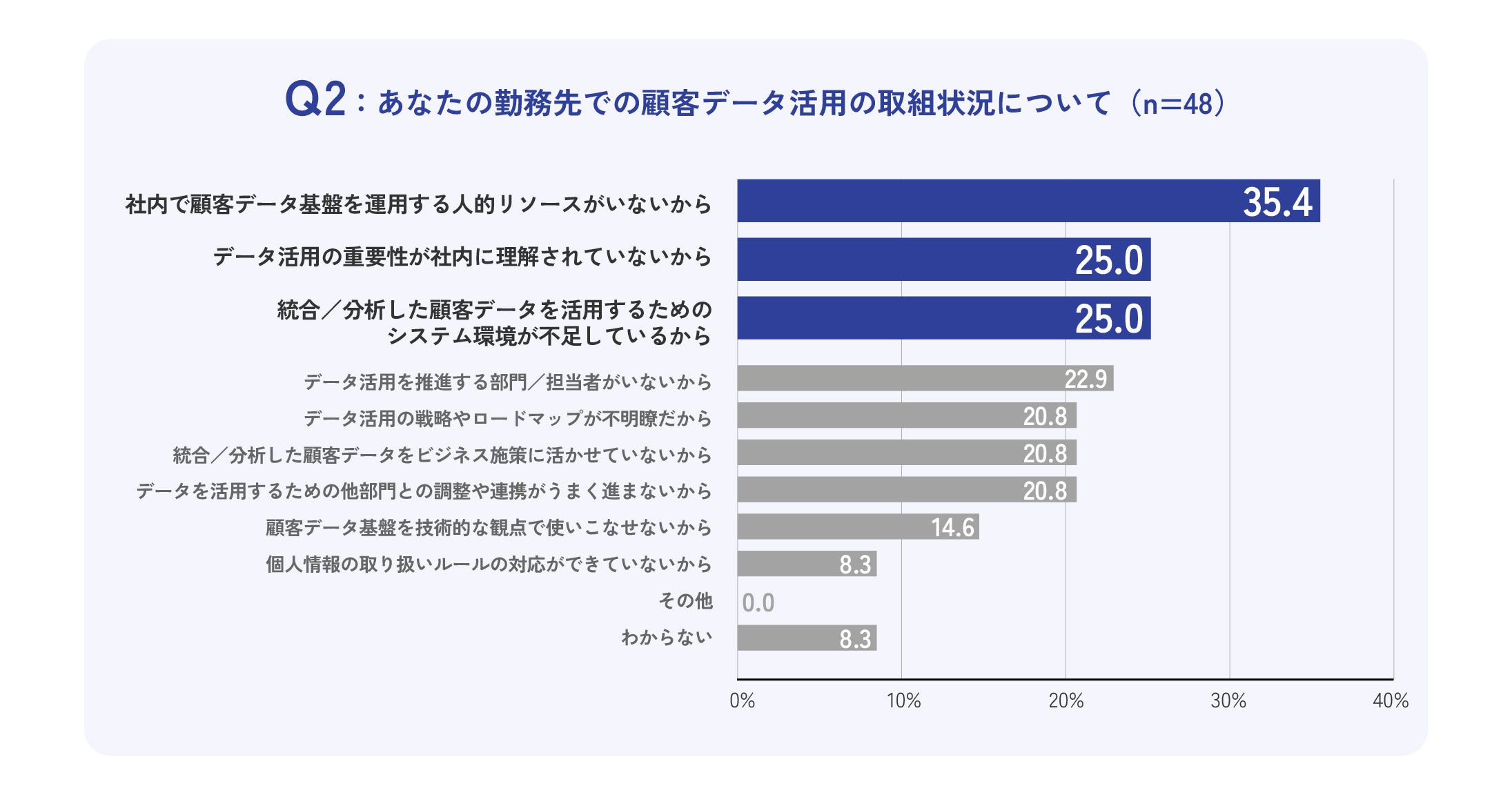 Q1で、「顧客データ基盤はないが、構築を検討している」、「顧客データ基盤はなく、かつ構築の予定もない」と回答した人に、顧客データ基盤を整備していない理由を尋ねたところ、「社内で顧客データ基盤を運用する人的リソースがいないから」が35.4%で最も多く、次に「データ活用の重要性が社内で理解されていないから」、「統合/分析した顧客データを活用するためのシステム環境が不足しているから」が同率の25.0%と続きました。