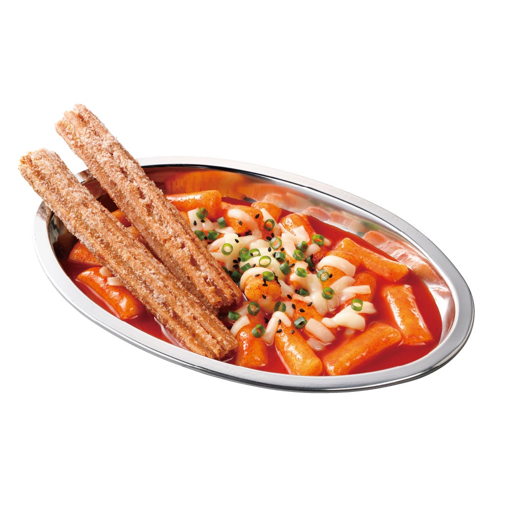 辛いbibigoオリジナルトッポッキに 甘いチュロスを丸ごとトッピングした異色トッポッキ(1,430円 税込)
