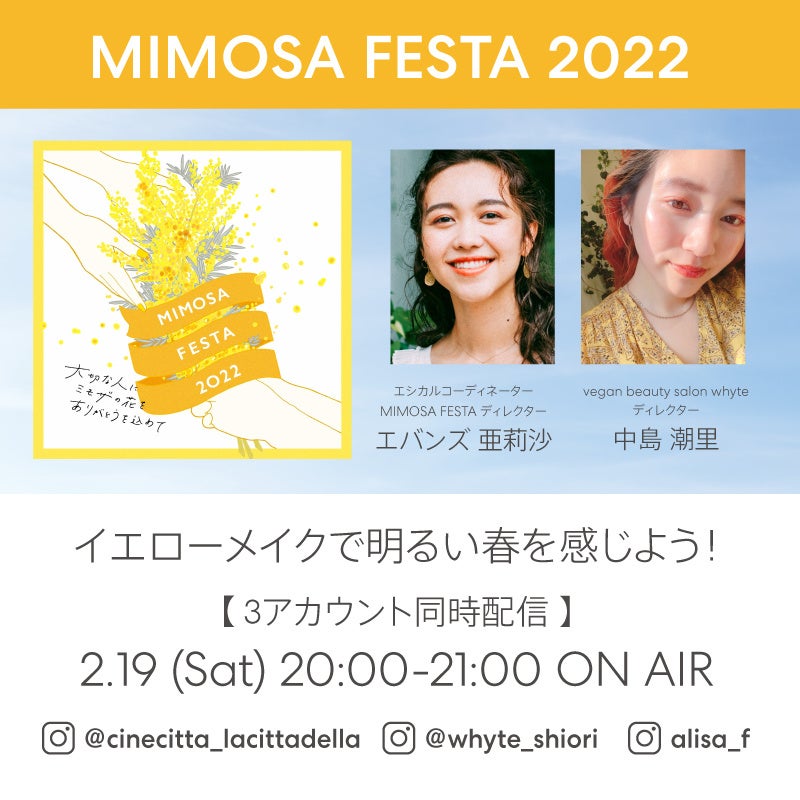 インスタライブでは、エシカルコーディネーター/MIMOSA FESTA ディレクターのエバンズ亜莉沙さんがモデレーターを務め、ゲストにvegan beauty salon whyteディレクターの中島潮里さんを迎え、「イエローメイクで明るい春を感じよう!」をテーマに、ミモザを思わせる鮮やかな「ハッピーイエロー」がアクセントの「オリジナル ファンデーション キット2022」のご紹介をします。また、ベアミネラルの商品を使った春のサステナブル メイクを指南していただきます。