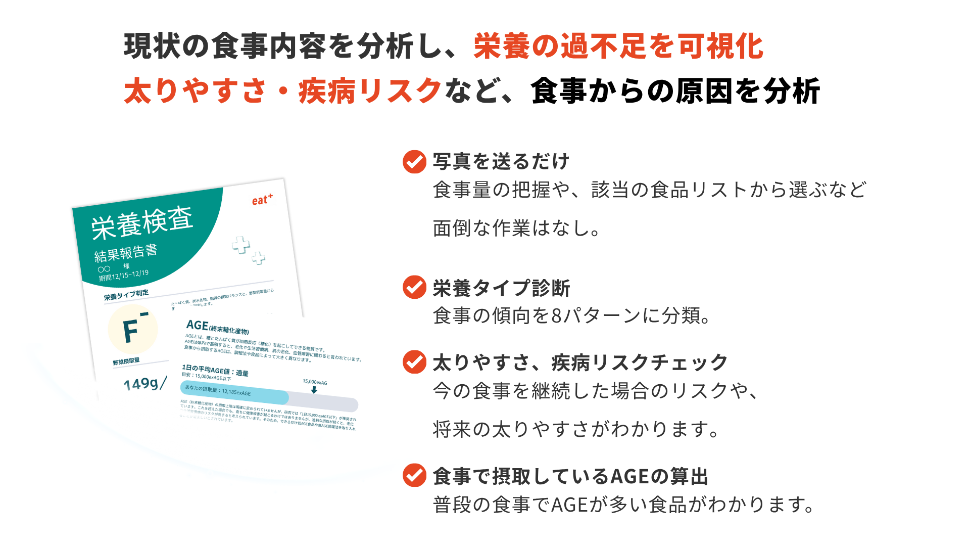eatas株式会社が提供する、クリニック向けパーソナル食事指導サービスが新規機能を追加。民間企業で初、写真を送るだけで"AGE"を算出し老化リスクを「見える化」、食行動の変容を促します。