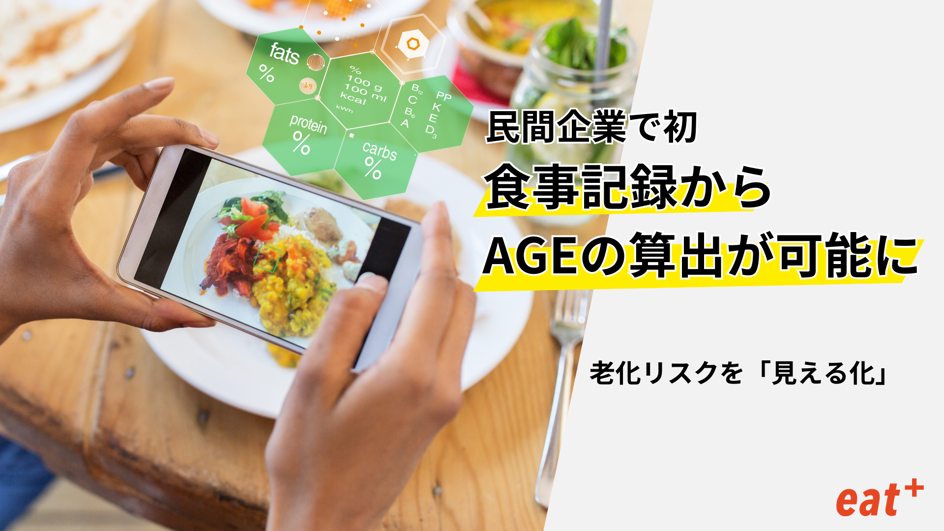 eatas株式会社(本社:福岡市中央区、代表取締役:手嶋英津子)は、食事記録からAGE(終末糖化産物)の推定値を算出できる技術を取得。すでに提供している食事分析(食事記録から現状の食事を数値化)にさらに老化、生活習慣病の改善につながるAGEの算出が民間企業として初めて可能になりました。美容・医療・企業の健康経営分野での導入を見据え、老化の要因となる「AGE」を可視化し、食事によるサポートを開始します。