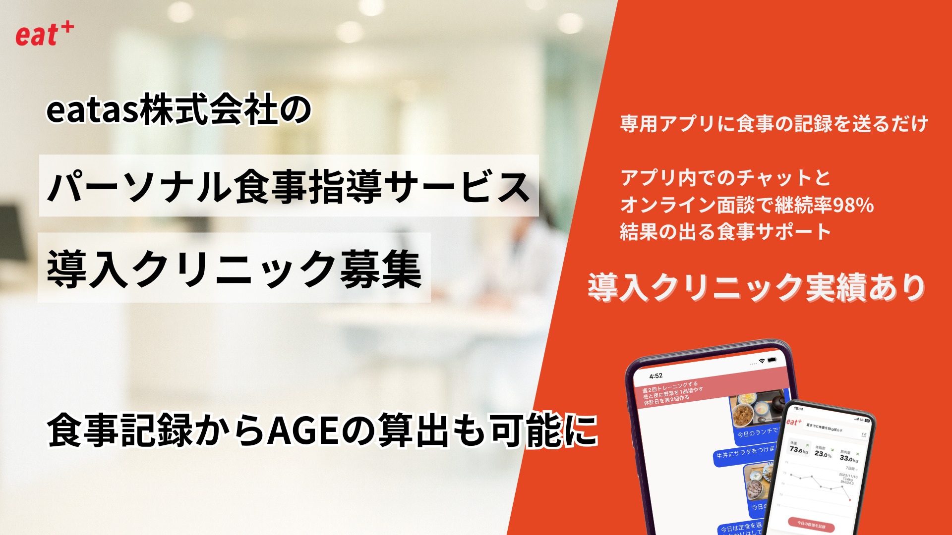 データを活用したパーソナル食事指導アプリ「eat+」を開発しており、ジムや美容クリニック向けに管理栄養士による食事指導を提供しています。イータスが独自に開発した「タイプ別×コーチング」の栄養管理メソッドをコミュニケーションツール化し、オンラインでも効果的な食事指導を実施しています。