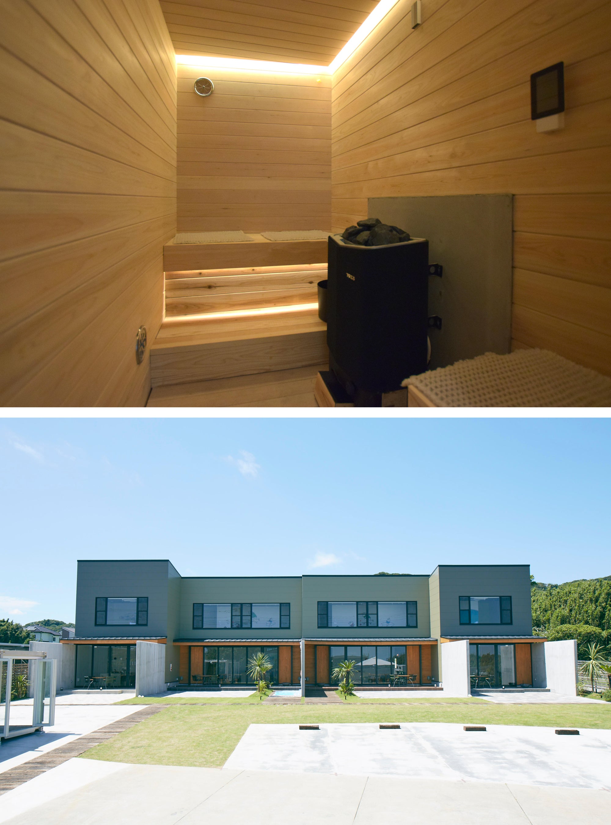 雑誌「サウナランド」の編集長である箕輪厚介氏とコラボレーションしたプライベートサウナを導入した全4棟の2階建てキュイジーヌリゾート型の宿泊施設です。1階はサウナ発祥の地であるフィンランドの入浴方法「ロウリュ」が楽しめるプライベートサウナをはじめ、巨大なアイランドキッチン、タイル調の浴室を設置しております。