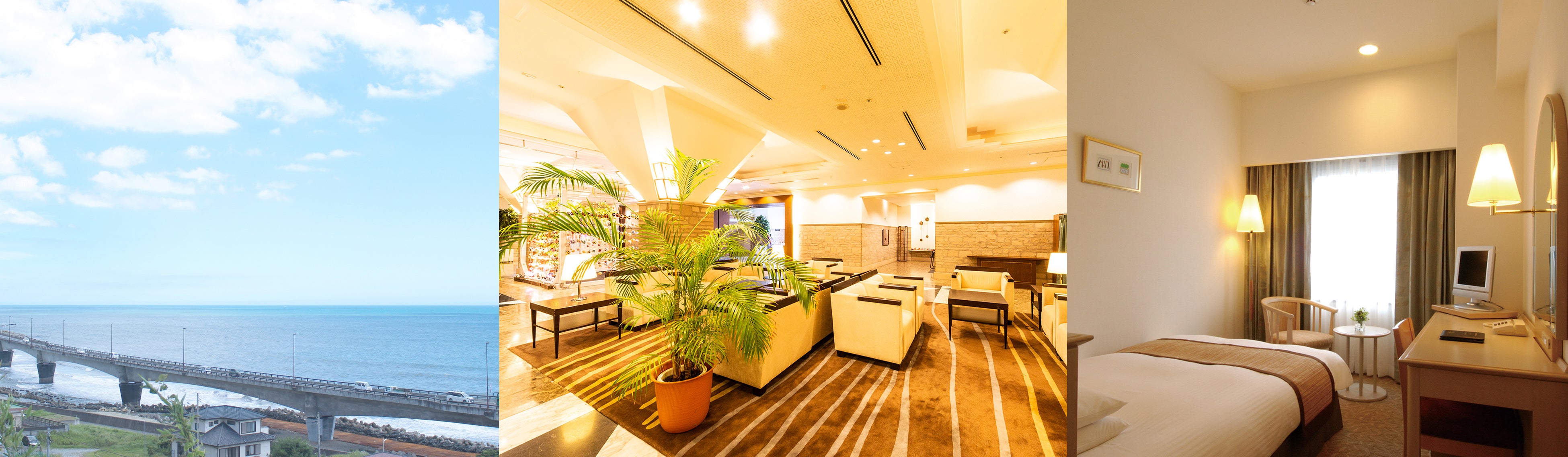 JR常磐線日立駅から徒歩2分、日立のさくら名所百選地としても名高い「平和通り」「かみね公園」にも近い絶好のロケーション。「ナチュラル・コンテンポラリー」をテーマにした心やすらぐくつろぎ の空間を展開しております。 美しい山々と太平洋の海、日立の街並みを望む121室のゲストルームを有し、本格中華を提供する「LIBRARY CAFE TRAX」や高級鉄板焼き肉レストラン「美都伎」も併設しております。少人数様から300名様まで、人数や目的に合わせてご利用いただけ る大・中・小14室の宴会場もご用意しております。 日立でのビジネス、観光の拠点としてお客様の旅をサポートするホテルテラ ザスクエア日立ならではの贅沢なひとときをお楽しみください。~「Smile Experience」笑顔で過ごせる場所でありたい~
