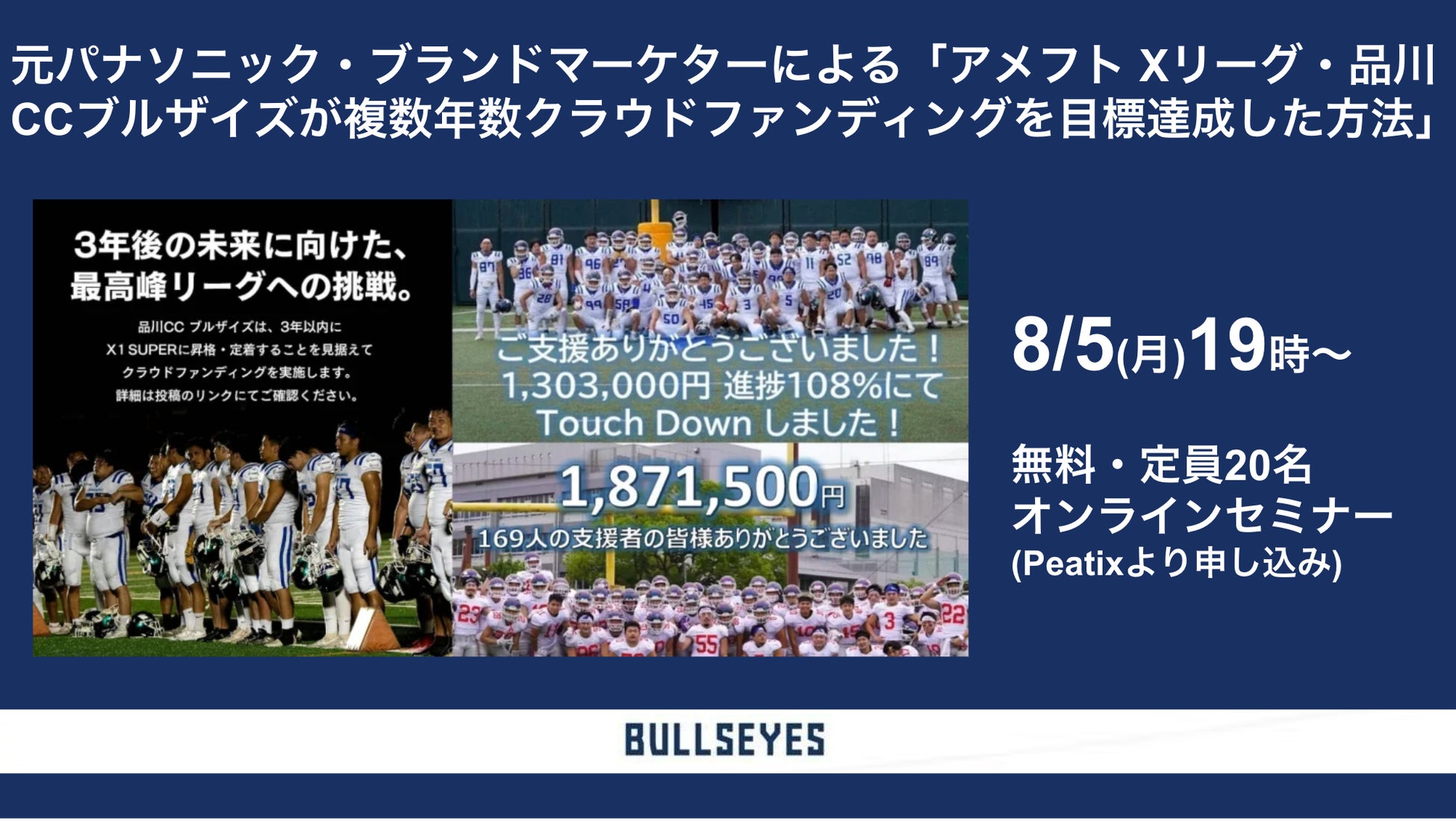 【無料・オンライン開催(8/5(月)19時より】元パナソニック・ブランドマーケターによる「アメフト Xリーグ・品川CCブルザイズが複数年数クラウドファンディングを目標達成した方法」