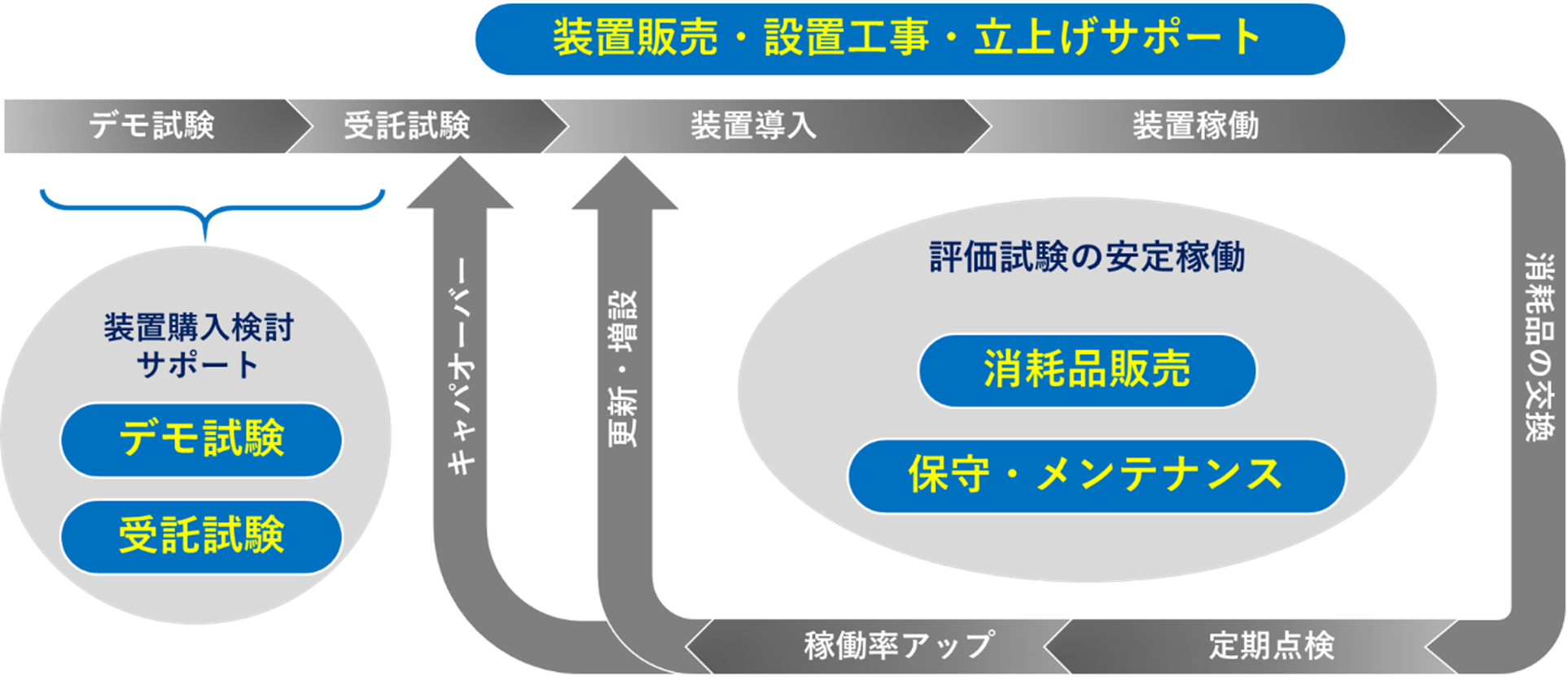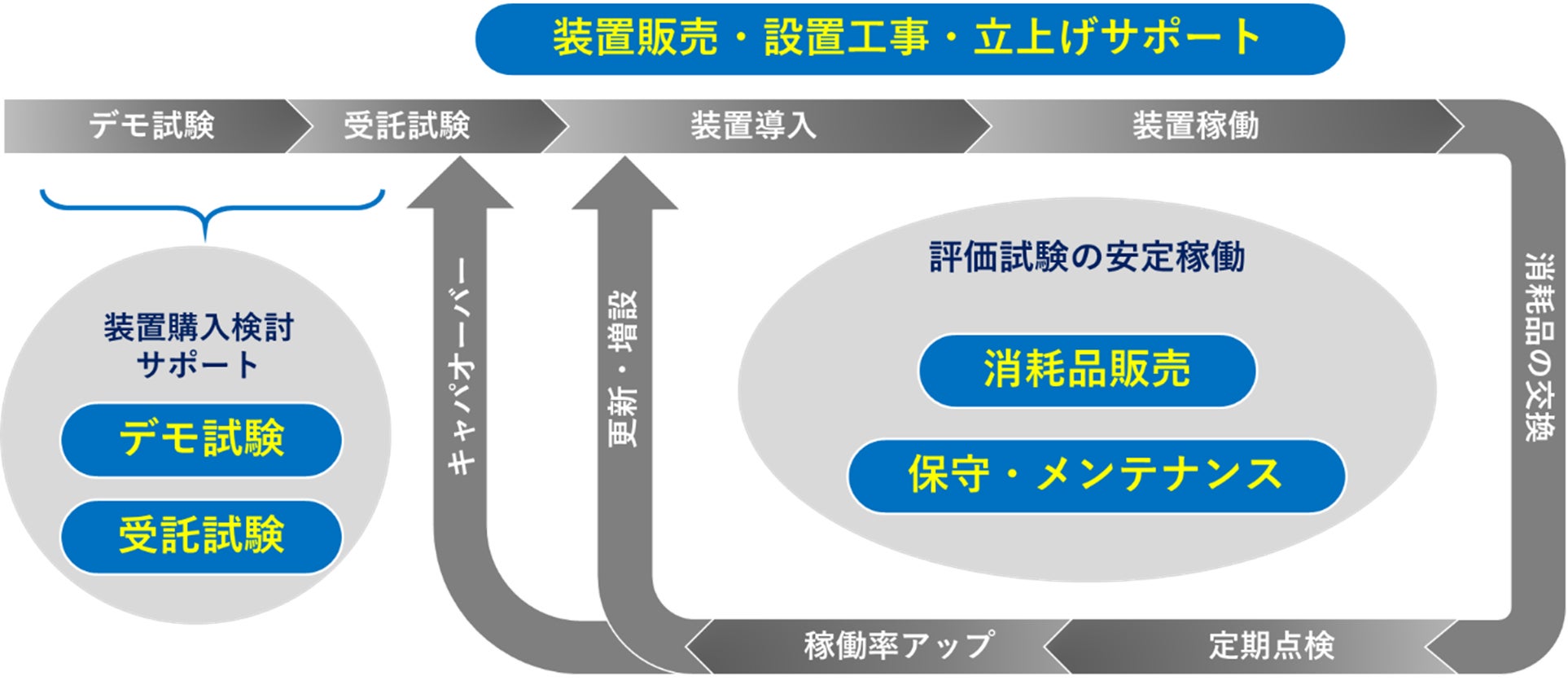 試験装置の購入前に、デモ試験や受託試験のサービスを行っております。本導入後も、設置工事や立ち上げサポート、保守・メンテナンスなどのアフターサービスにより皆様の研究開発体制を支援します。