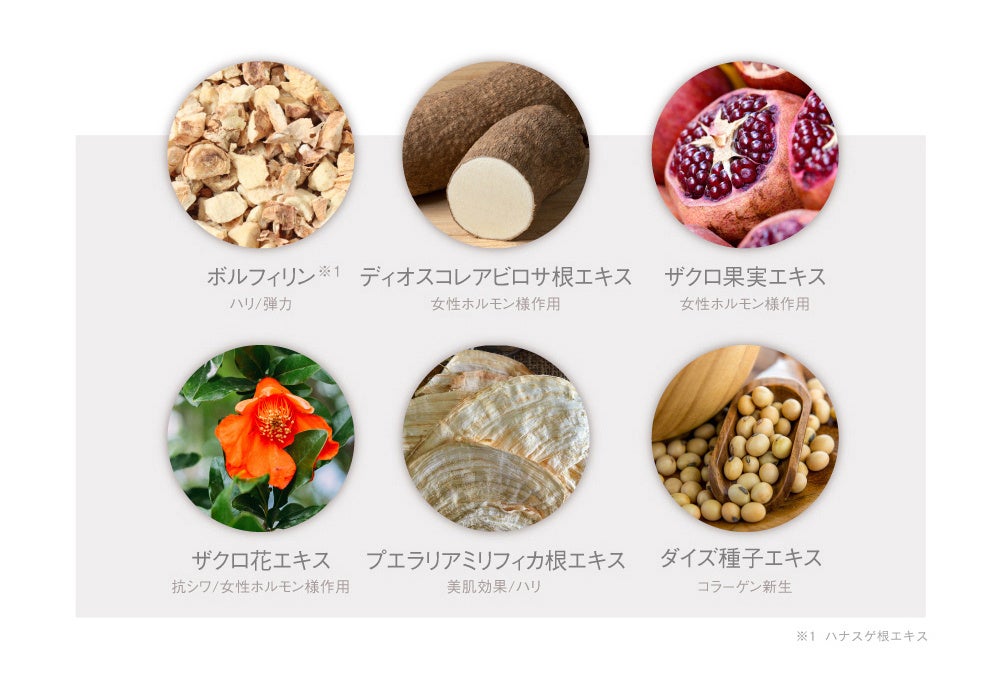 ボルフィリン(ハナスゲ根エキス)、ディオスコレアビロサ根エキス、ザクロ果実エキス、ザクロ花エキス、プエラリアミリフィカ根エキス、ダイズ種子エキス (※・・・肌にハリと弾力を与えること)