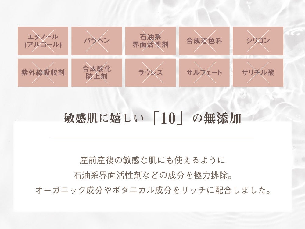 産前産後の敏感な肌にも使えるように、石油系界面活性剤などの成分を極力排除。