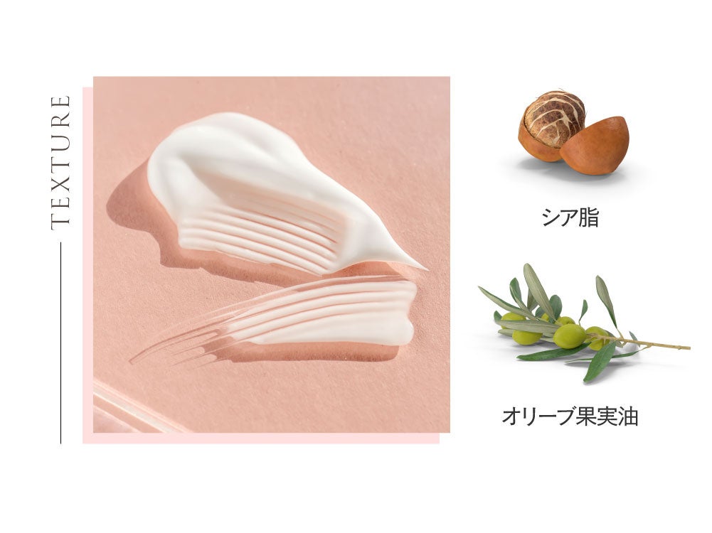 3種類のセラミド(NP・AP・EOP)、加水分解シルク、加水分解コンキオリン、加水分解コラーゲン、ヒアルロン酸Na、その他、シア脂、オリーブ果実油をはじめとするボタニカルエキス多数配合