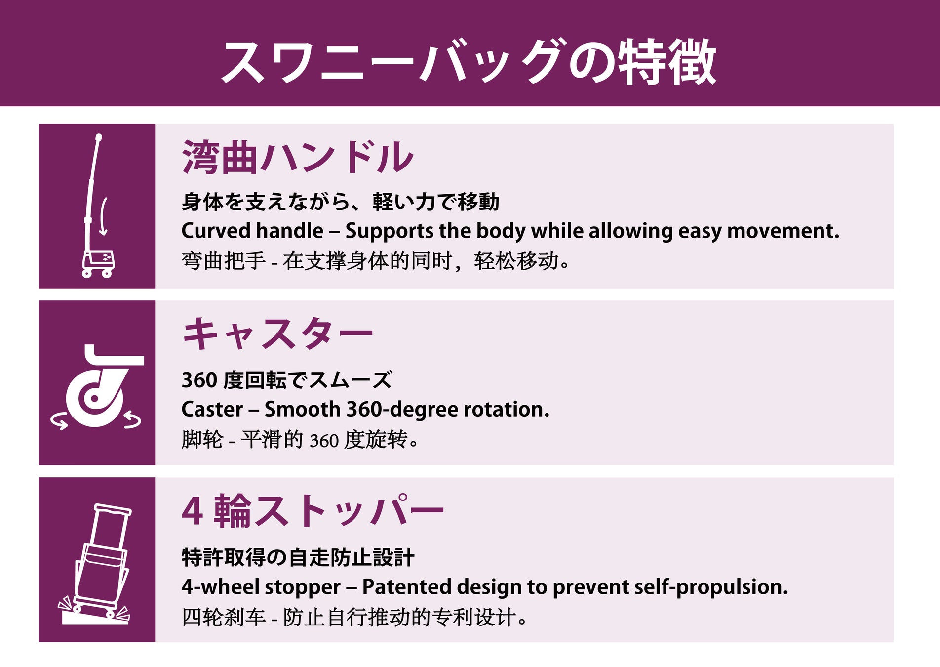 SWANYは、1937年創業の老舗メーカーです。歩行に不安のある方でも安心して外出できるよう、機能的で使いやすいキャリーバッグを開発・販売しています。