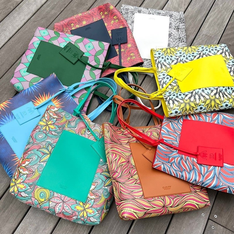 個性豊かなオリジナルテキスタイルをフェイクレザーに施したバッグ。