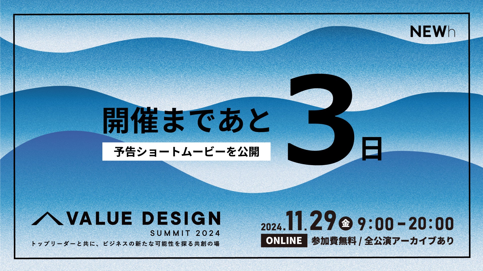 株式会社NEWh(本社:東京都千代田区、代表取締役社長:神谷 憲司)は、11月29日(金)に企業のリーダー人材向けオンラインカンファレンス「VALUE DESIGN SUMMIT 2024」を開催します。それに先立ち、予告ショートムービーを公開しました。