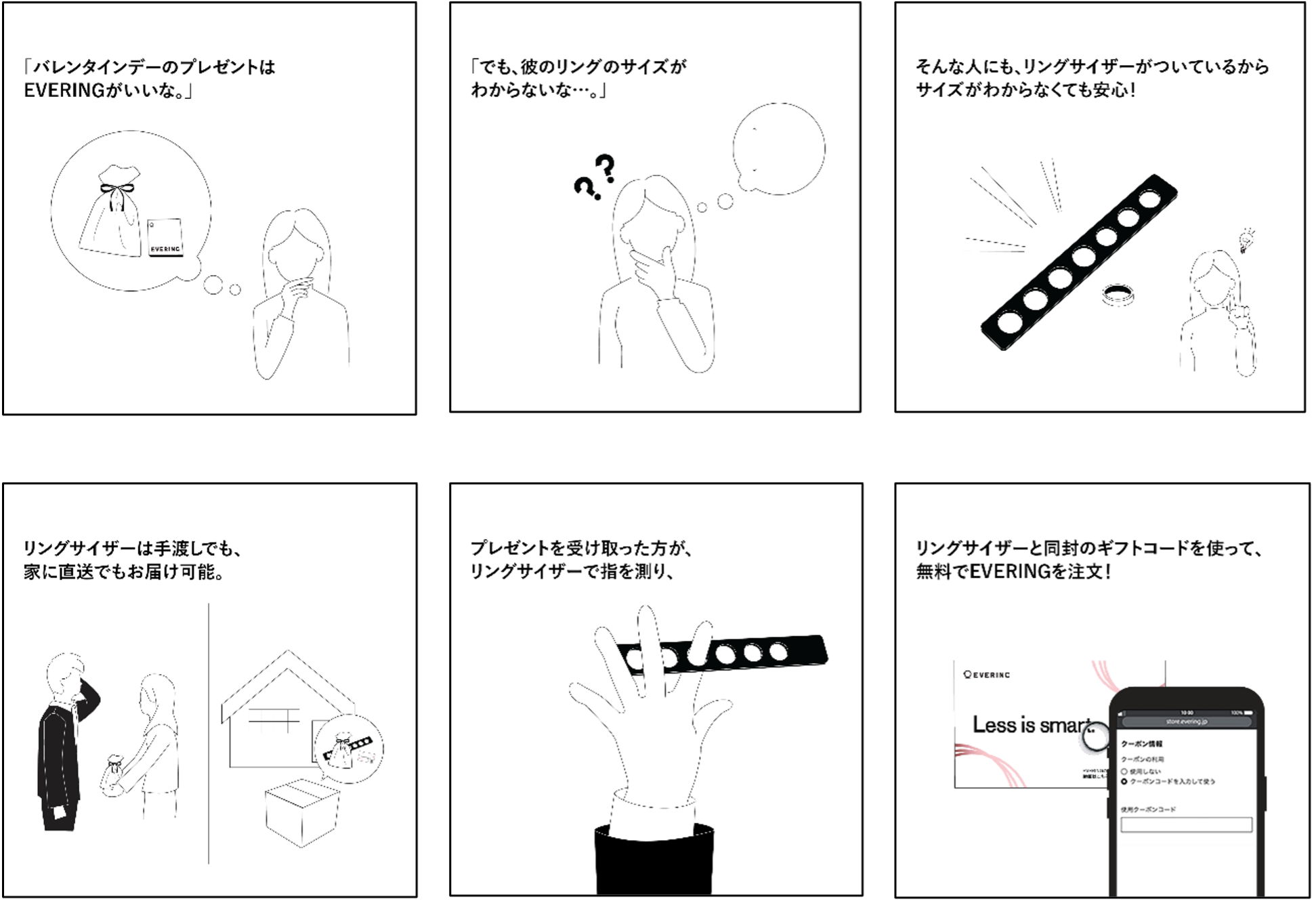 「EVERING(エブリング)」は、キャッシュレス決済+ドア解錠機能搭載のスマートリングです。今回のバレンタインキャンペーンでは、期間中に商品をご購入頂いた方を対象に、EVERING本体に好きな文字を入れる「刻印サービス」、大切な方にギフトとしてお届けする際の「プレゼント包装」を無償提供します。プレゼントで購入する際に、お相手のリングサイズが分からない場合は、指輪のサイズを計測できるリングサイザーとEVERINGが無料になるギフトコードをお送り出来ます。これにより、お相手の指に合ったリングを送ることができ、安心してプレゼントとしてご利用いただけます。バレンタインギフトや、ご友人へのプレゼント、自分へのご褒美など、様々なシチュエーションでご利用ください。「タイパ」が求められる現代において、“1秒決済”ができる「EVERING」を、特別なプレゼントとして贈ってみてはいかがでしょうか?