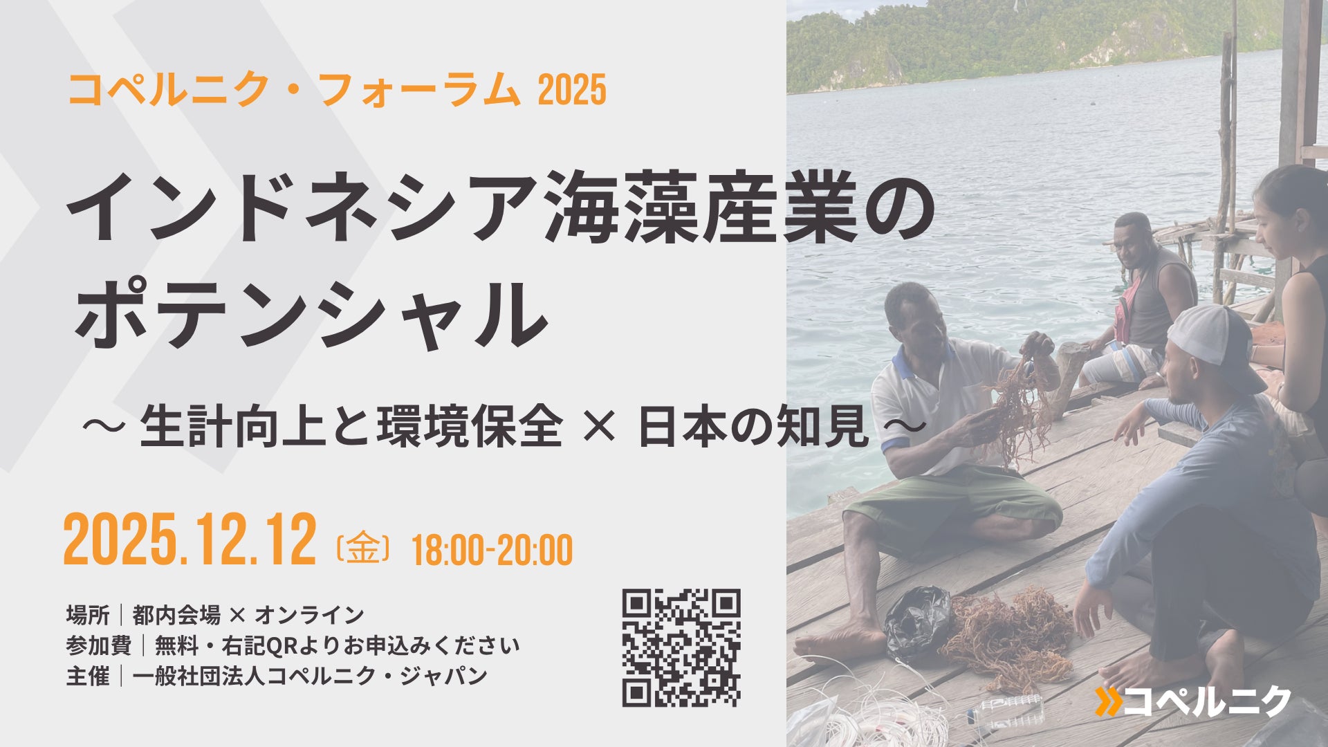 コペルニク・ジャパンは12月12日(金)に、コペルニクフォーラム2025:インドネシア海藻産業のポテンシャル〜生計向上と環境保全 × 日本の知見〜 を開催いたします。