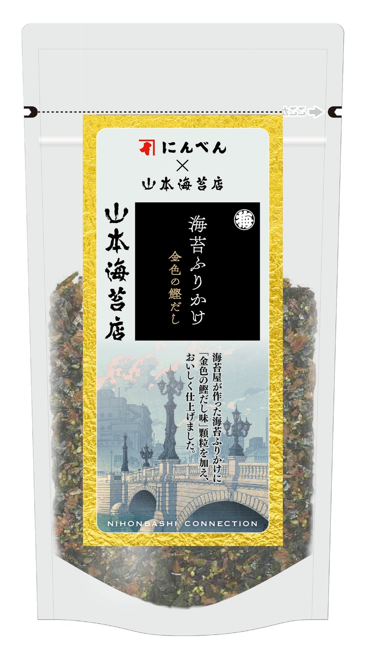 株式会社山本海苔店(本社:東京都中央区/代表取締役社長:山本貴大)は、老舗かつお節専門店「にんべん」の金色の鰹だし顆粒を使用したふりかけ「海苔ふりかけ 金色の鰹だし」を3月15日より発売いたしました。こだわり抜いた海苔と鰹だしのうま味たっぷりのふりかけです。