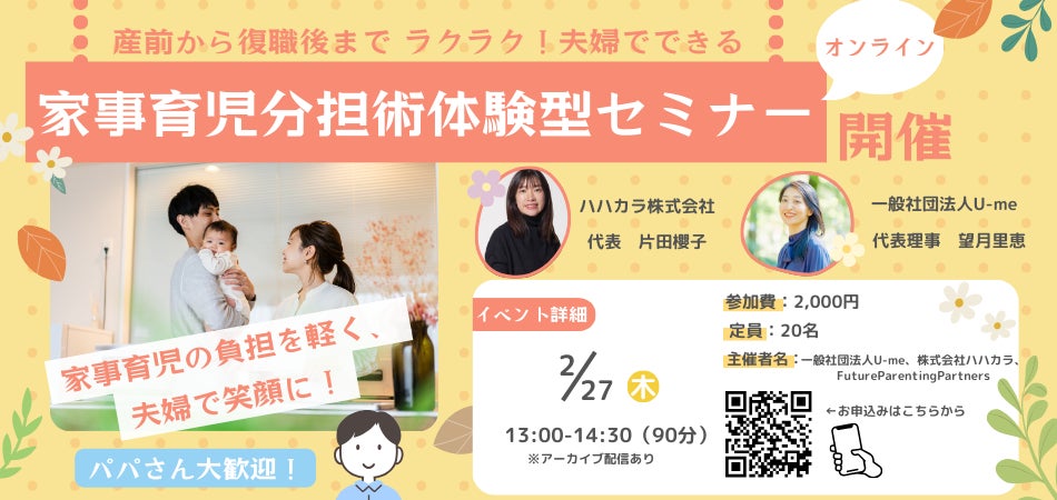 株式会社ハハカラ(本社:東京都品川区、代表:片田櫻子)と一般社団法人U-me(本社:大阪府大阪市、代表理事:望月里恵)は、オンラインにて共働き家庭の家事育児分担を支援する体験型セミナー「産前から復職後までラクラク!夫婦でできる家事育児分担術」を開催します。本イベントでは、夫婦での家事分担のコツやコミュニケーション術を学び、即実践できるスキルを体験型ワークを通じて提供いたします。