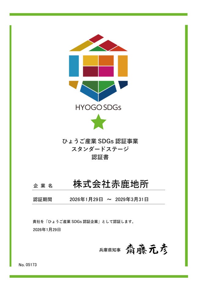 株式会社赤鹿地所(本社:兵庫県姫路市辻井1丁目1番23号、代表取締役:赤鹿 保生)は、兵庫県が推進する「ひょうご産業SDGs認証制度」において、「ひょうご産業SDGs認証企業(スタンダードステージ)」を取得しました。