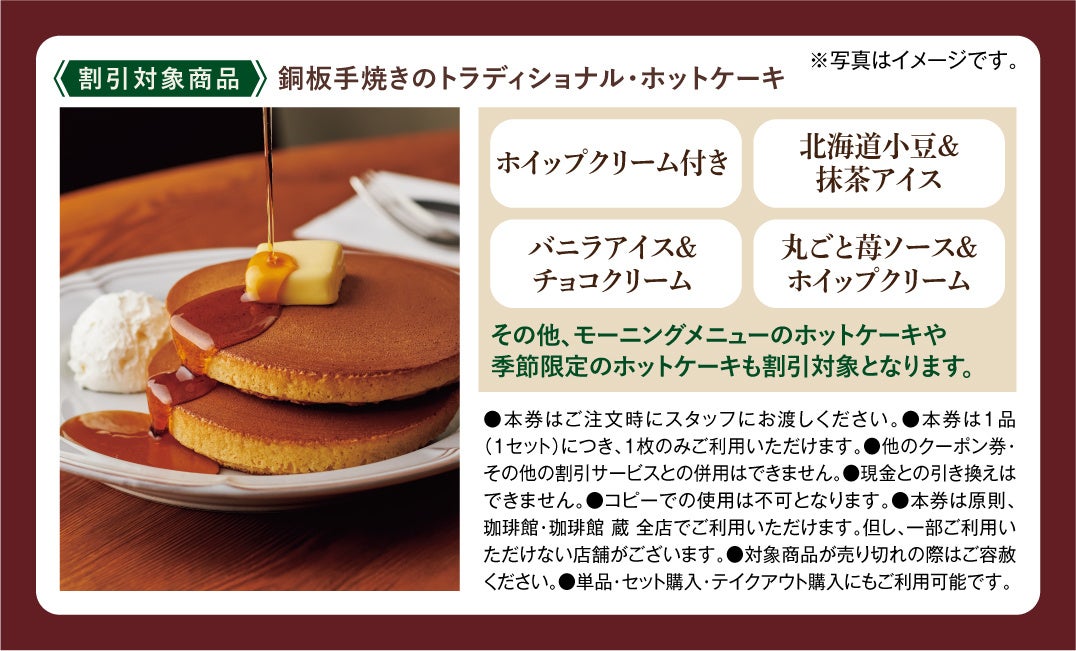 次回お会計時、対象のホットケーキ(モーニング・期間限定メニュー含む)が、50円、100円、200円引きのいずれかとなります。