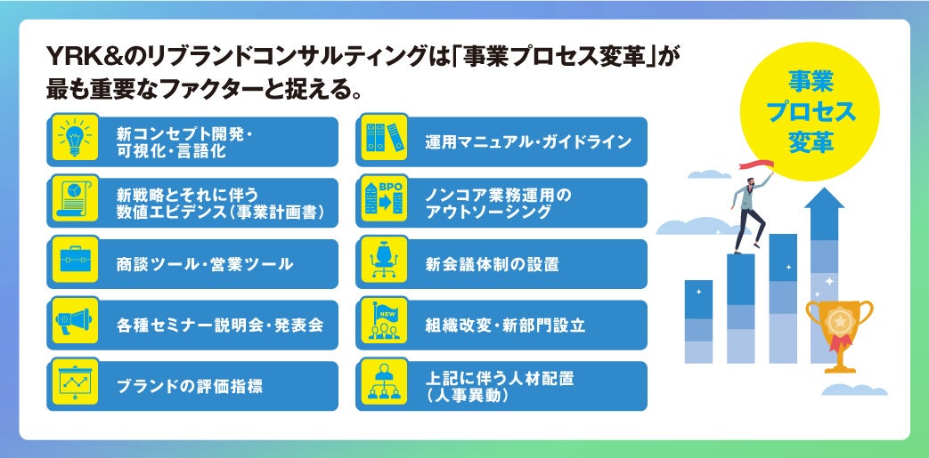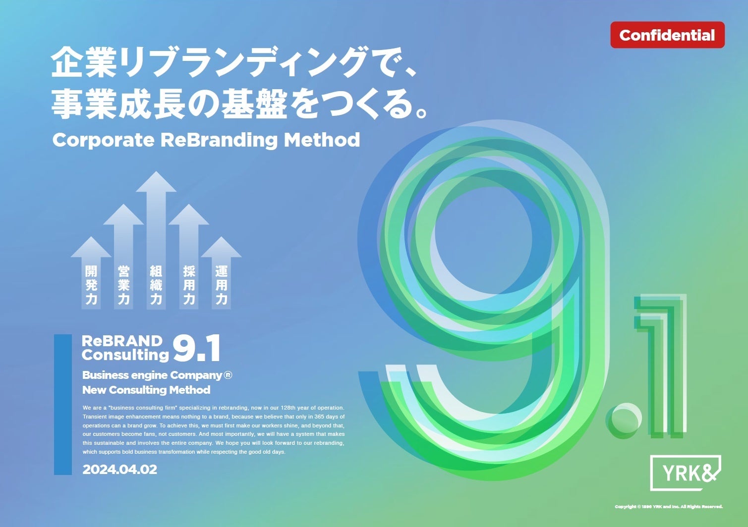 1896年の創業から128年の実績を持つ「リブランディング支援専門」の事業コンサルティングファーム、株式会社 YRK and(本社:大阪市中央区、代表取締役社長:中許 将一、 https://www.yrk.co.jp/ )は、コンサルティングメソッド“ReBRAND CONSULTINGのVer.9.1をリリース致します。