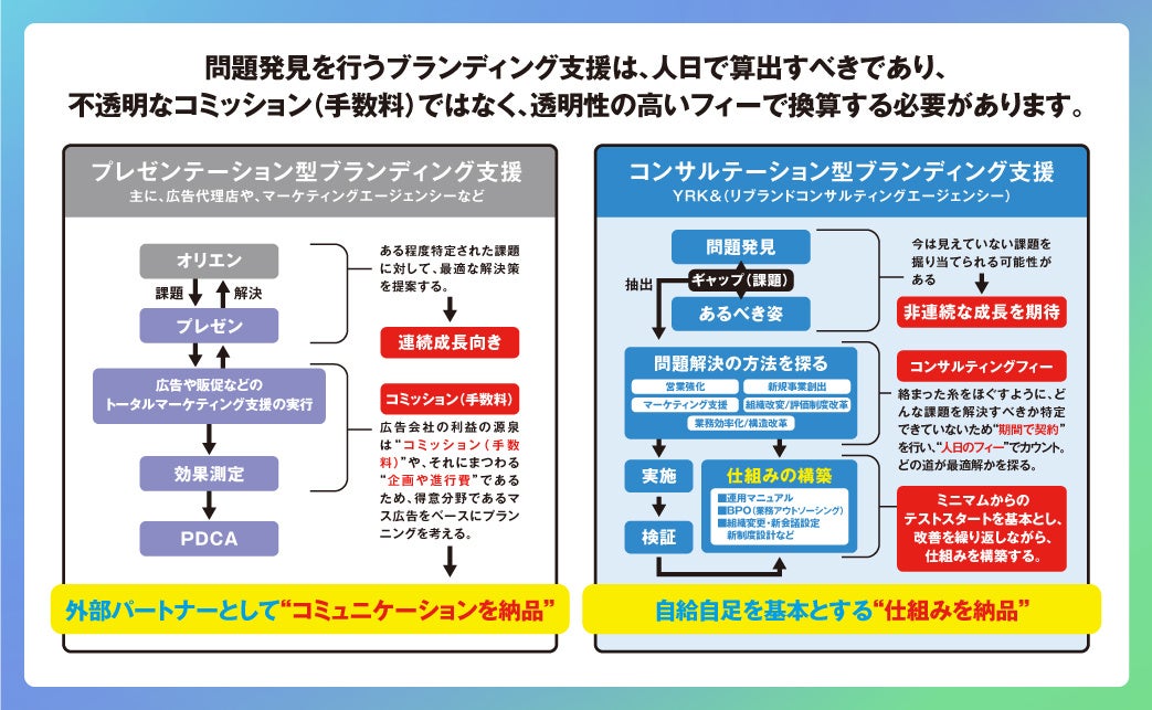 ブランディングの仕事を、広告代理店が支援するケースが多かった時代が長く続きました。しかし、ブランディングは広告ではなく、顧客体験価値そのものを変革させなければならないとの認識が一般化したことで、広告業界以外の企業の活用やCMO(チーフマーケティングオフィサー)を招聘するなど、さまざまなケースが増えてきました。しかし、過去の流れから、ブランディングの外部支援は、いまだに広告制作や媒体のマージンを主とした価格設定が多く見られます。本来リブランディングは、すべての事業バリューチェーンの中のどこに欠陥があるのかが分かっていない状態からスタートします。そのため、その問題を発見するプロセスは、人日で算出すべきであり、透明性の高いフィーで換算する必要があります。また、アウトプットの質ではなく、量に比例して費用が増えるマージン形式は、そもそも不適切で、不透明ともいえます。YRK&のリブランドコンサルティングは、フィーシステムを採用し透明性のある支援を行います。