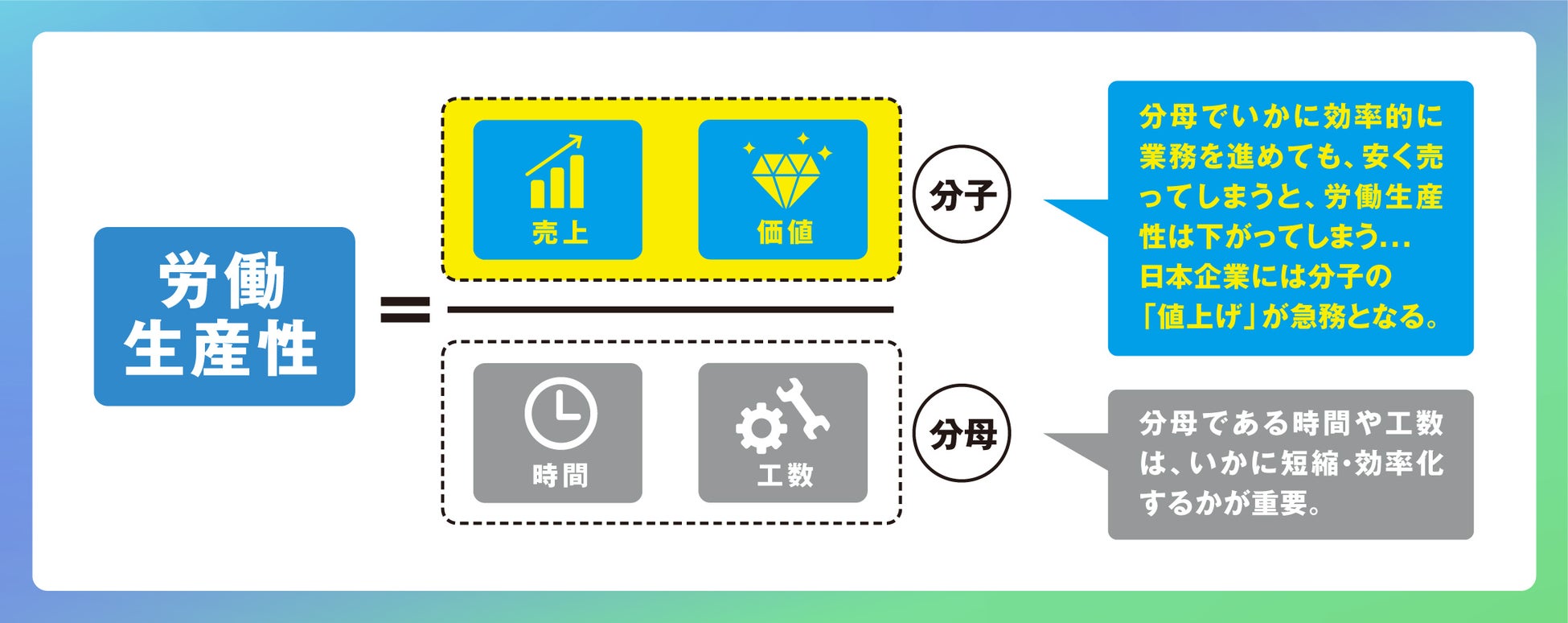 近年、業績を向上させるための手段として注目されているのは、業務効率を上げるためのDX導入や、AI活用、また合理性を重視したマネジメントを反映することによる生産性向上。売上の向上もさることながら、ムダやムラを排除することにより生産効率をあげることで、効率的に事業再生をしていく手法が多く議論されてきました。しかし、事業における業績の本質的な問題点は、「どんなに効率的に業務を進めても、結果として作ったものを安く売ってしまうと、生産性は下がってしまう」ということにあります。日本の企業生産性の低さは、低価格化によるものが非常に大きいのです。つまり、今の日本の企業にとって、「値上げ」は急務であり、最も重要な成長因子といっても過言ではないのです。