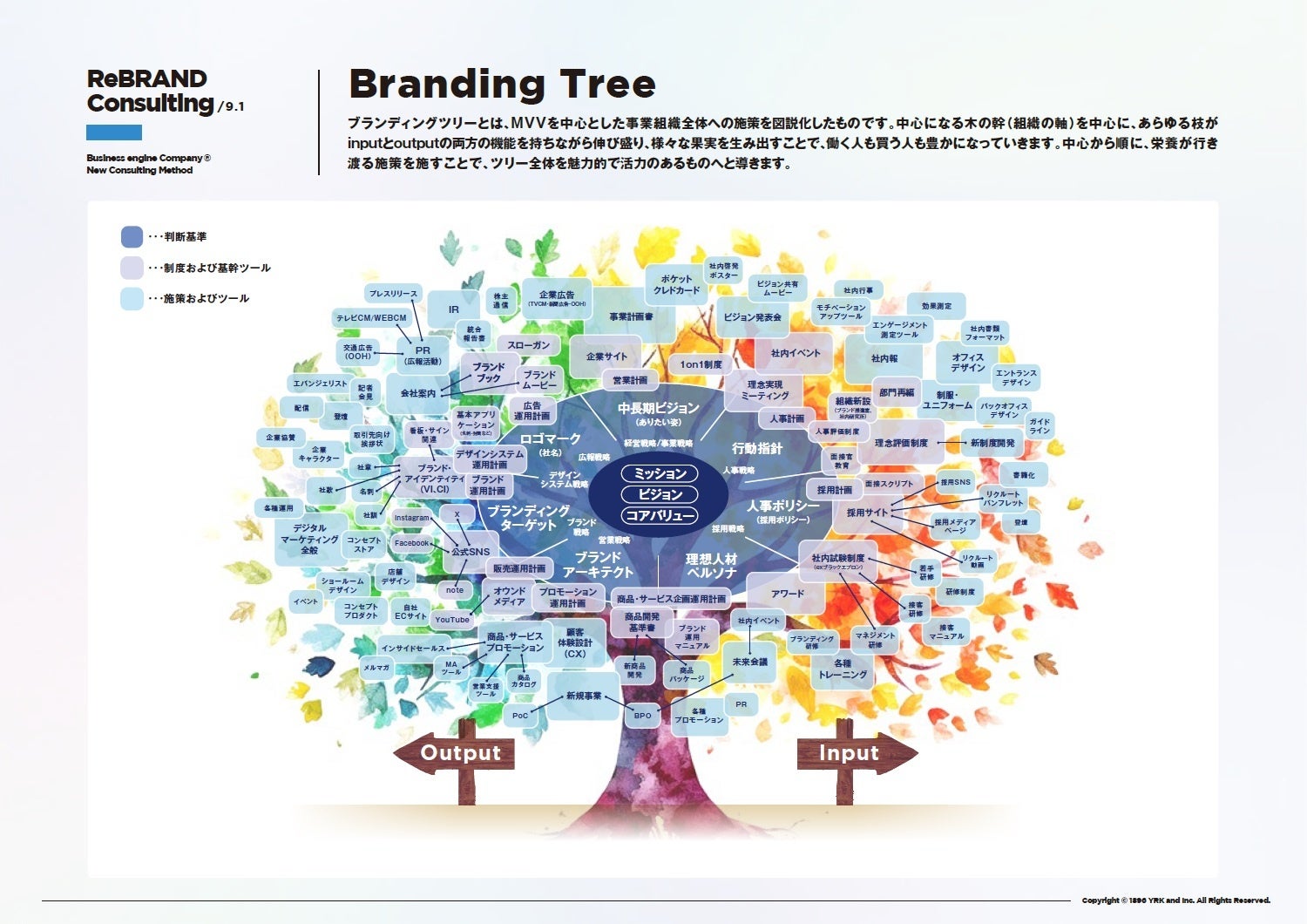 Branding Tree™とは、MVVを中心とした事業組織全体への施策を図説化したものです。中心になる木の幹(組織の軸)を中心に、あらゆる枝がinputとoutputの両方の機能を持ちながら伸び盛り、様々な果実を生み出すことで、働く人も買う人も豊かになっていきます。中心から順に、栄養が行き渡る施策を施すことで、ツリー全体を魅力的で活力のあるものへと導きます。