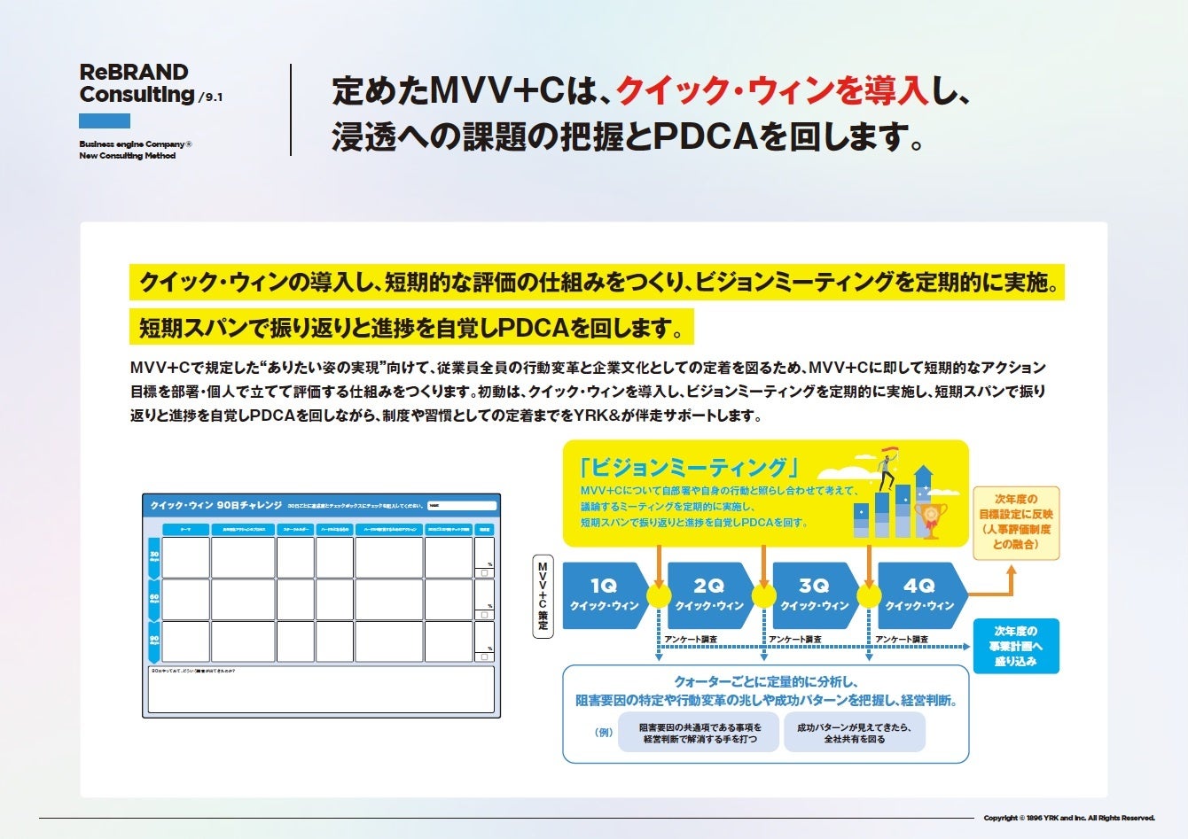 MVV(ミッション、ビジョン、コアバリュー)で規定した“ありたい姿の実現”向けて、従業員全員の行動変革と企業文化としての定着を図るため、MVVに即して短期的なアクション目標を部署・個人で立てて評価する仕組みをつくります。初動は、クイック・ウィンを導入し、YRK&が制度や習慣としての定着までを伴走サポートします。